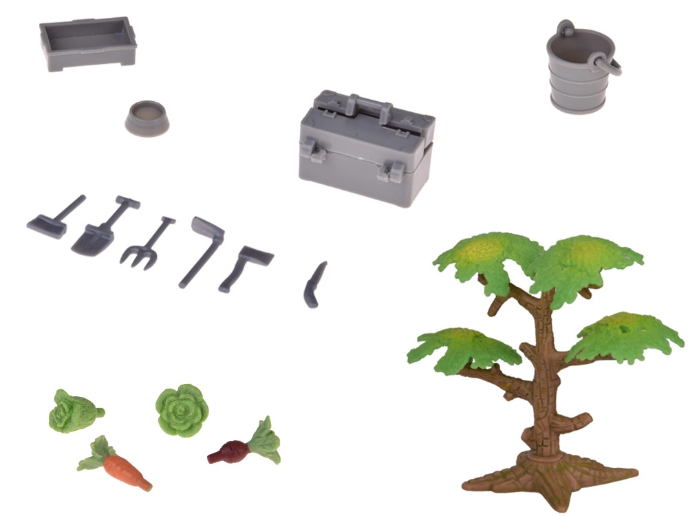- Rijke uitrusting: dieren (koeien, varkens, paarden, schapen, honden), boeren, gereedschap, hekken, boom, windmolen en meer.