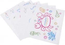 Inclusief dubbelzijdige sjablonen met zeethema. Kinderen kunnen ze achter het paneel schuiven en gemakkelijk de eerste afbeeldingen overtrekken.