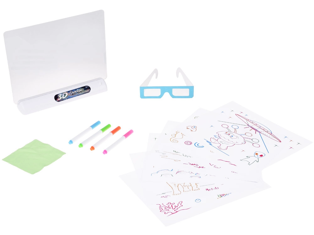 De transparante plaat met LED-verlichting laat de lijnen van de stiften oplichten. Met de 3D-bril krijgen tekeningen een realistisch diepte-effect en een wow-factor.