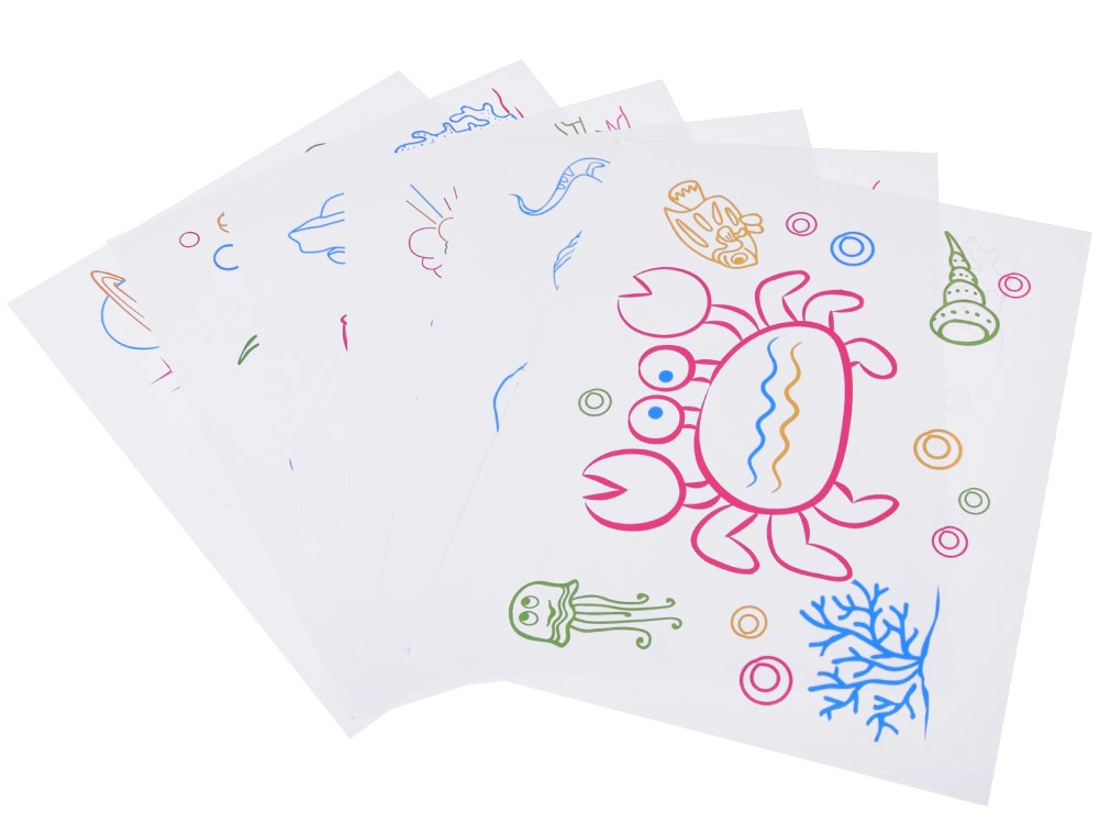 Het bord is makkelijk afwasbaar – veeg het af met een doekje en teken opnieuw. In de set vind je 4 gekleurde stiften en dubbelzijdige voorbeelden met zeemotieven, die helpen met de eerste inspiratie en kinderen leren omgaan met kleuren en vormen.