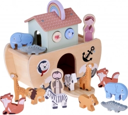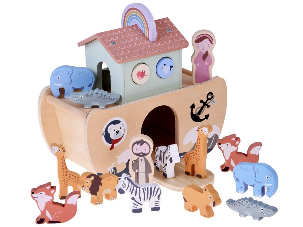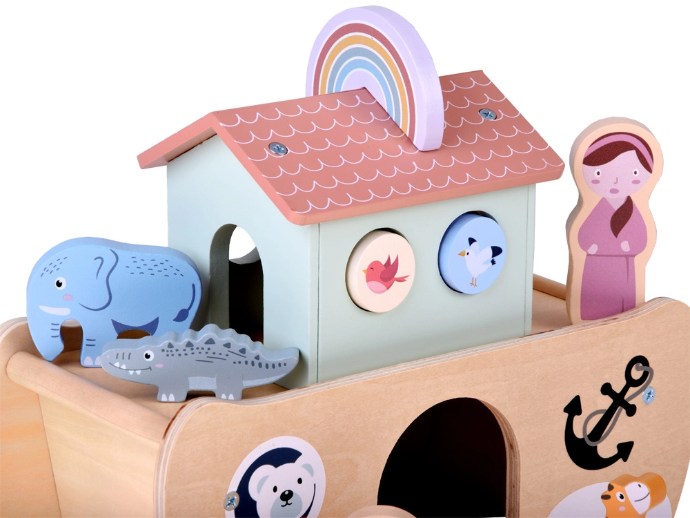 De ark heeft openende elementen, een helling en openingen waardoor kinderen de dieren kunnen insteken. Op een speelse manier trainen ze zo fijne motoriek en logisch denken.