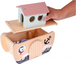 Het speelgoed is gemaakt van glad hout en geverfd met veilige, niet-giftige verven. Dankzij de robuuste constructie is het ideaal voor dagelijks spelen en leren. Na het spelen kunnen alle onderdelen handig in de romp van de boot worden opgeborgen, zodat er niets zoekraakt.