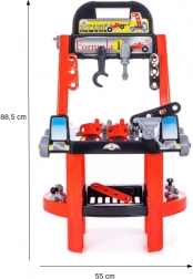 De set voor kleine klussers bevat een compacte werktafel met een plank onder het werkblad en een haak voor het ophangen van gereedschap aan de bovenzijde. Inclusief schroevendraaier, steeksleutel, platte elementen om te schroeven, schroeven en moeren, draaielementen, bankschroef en een beschermende helm. Er is ook een set stickers voor een aantrekkelijke uitstraling van de hele werkplaats.