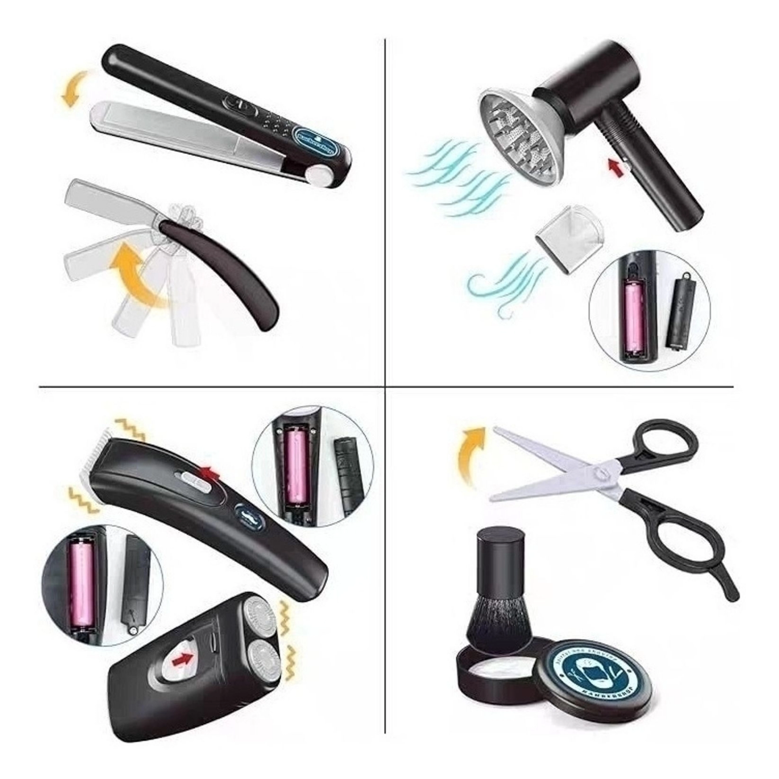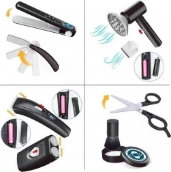 - Rijke uitrusting 24 stuks: opzetstukken, scharen, kammen, stijltang, spiegeltje, scheermes en meer.