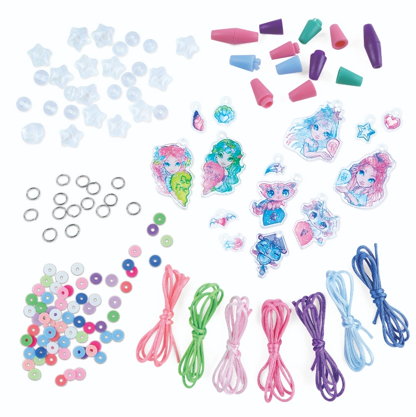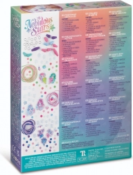 - 7 grote glinsterende acrylhangers, 7 kleine acrylhangers, 98 verschillende kralen, 14 verbindingsringetjes, 7 gekleurde zijden koordjes, vel met zelfklevende steentjes, kleurrijke handleiding