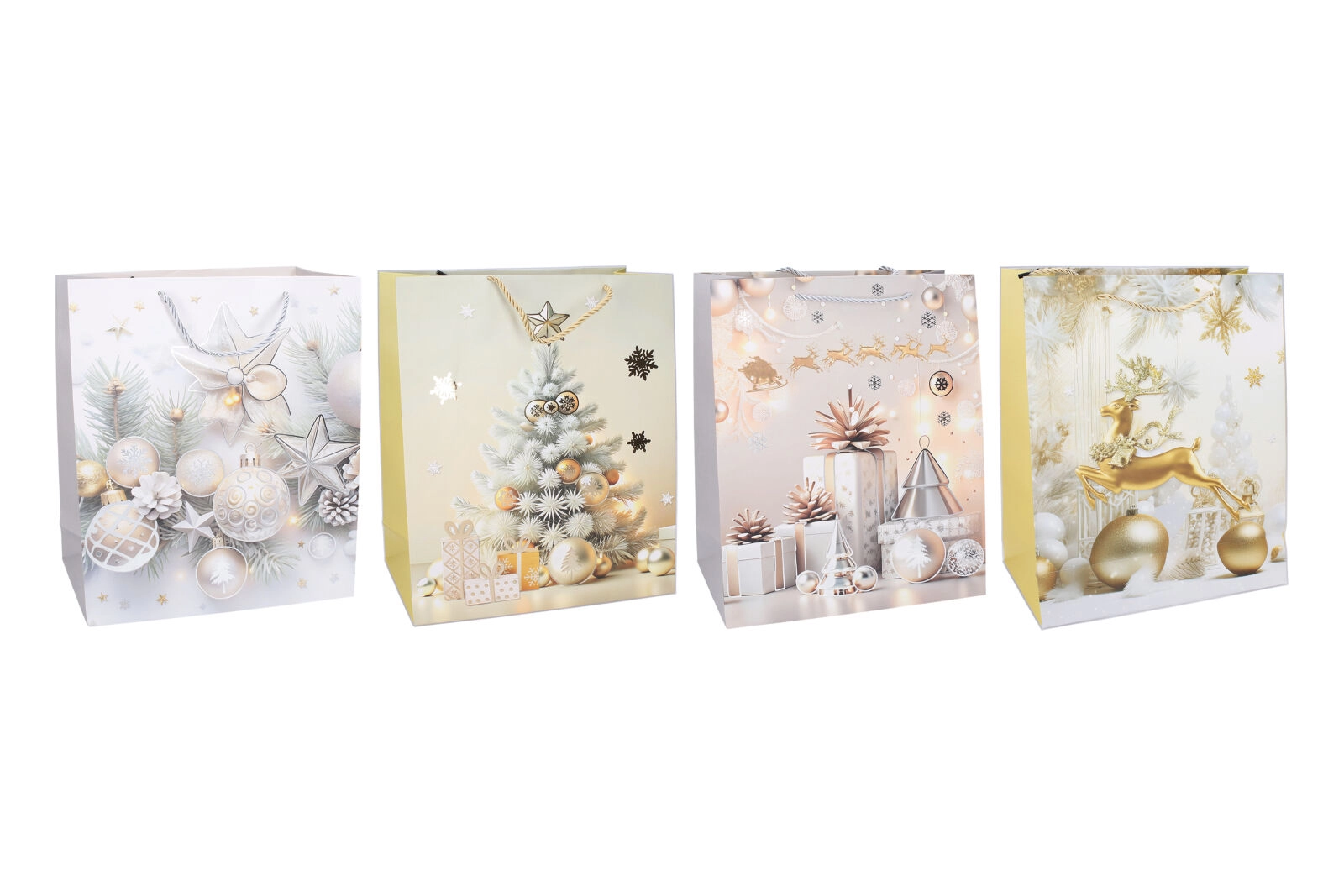 Elegante cadeautas in maat L voor feestelijk en zorgeloos inpakken. Ideaal voor middelgrote tot grotere cadeaus, met kerstmotieven voor de perfecte sfeer. Verkrijgbaar in 4 varianten, met praktische afmetingen van 31 × 40 × 12 cm en een stevige uitvoering voor veilig dragen.
