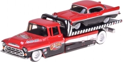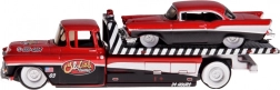 De takelwagen CHEVROLET Flatbed 1957 is uitgerust met een gedetailleerde oprijplaat die echte transporten van een klassiek voertuig natuurgetrouw nabootst.