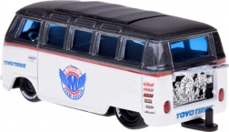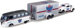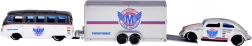 De Volkswagen Van Samba is uitgerust met een trekhaak voor het aankoppelen van de aanhanger; de haak is naar wens afneembaar, en de aanhanger kan losgekoppeld worden zonder de haak los te schroeven. De volledige set is ideaal voor liefhebbers van klassieke auto’s, 1:64-verzamelaars en kinderen die van creatief spel houden.