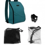 De set bevat alles wat je nodig hebt: een stijlvolle rugzak voor de kinderwagen, bekerhouder, muggennet en regenhoes. Een optionele koppelingsset adapters maakt het mogelijk twee kinderwagens te verbinden tot een praktisch broer/zus- of tweelingoplossing. Niet te missen: 5‑punts veiligheidsgordels en een ruime mand met draagvermogen van 2 kg.