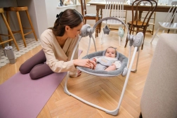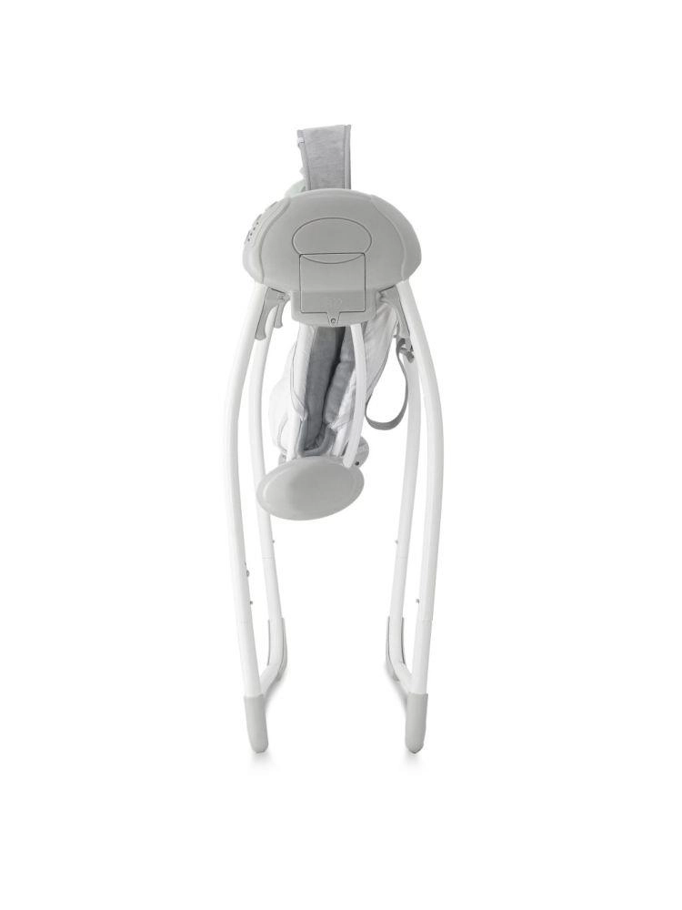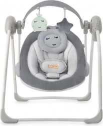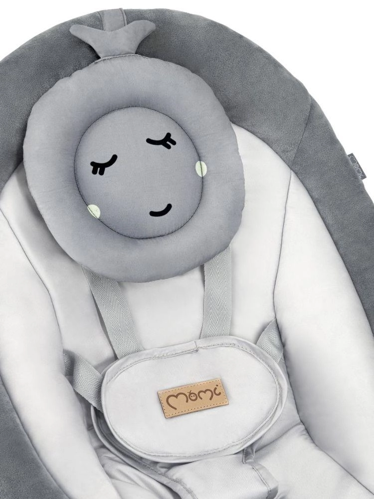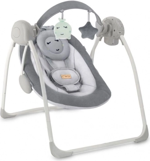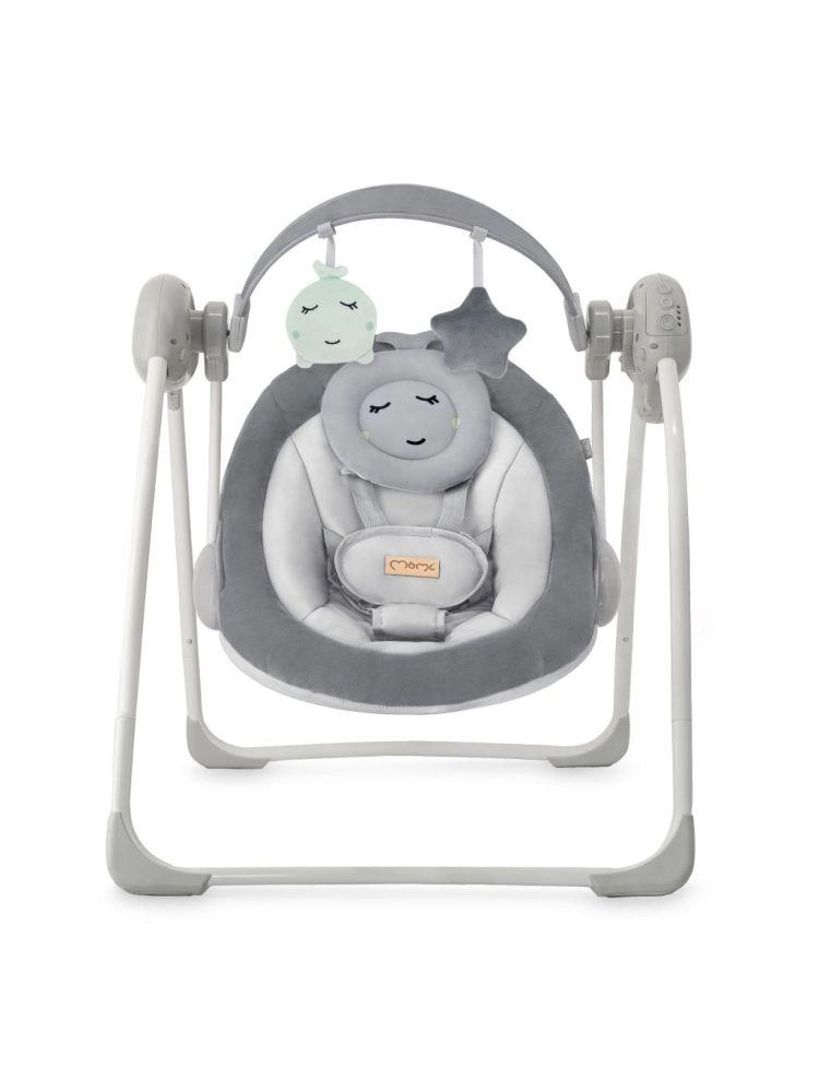 Elektrische schommelwip MOMI Liss in elegant grijs kalmeert en vermaakt je baby dankzij 5 schommelsnelheden, een timer en 6 melodieën. Hij heeft een stabiele, opvouwbare constructie, een zachte zitting met kussentje en 5-punts gordels voor veilig en comfortabel gebruik thuis en onderweg.