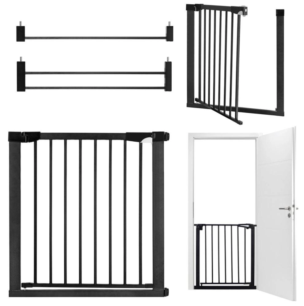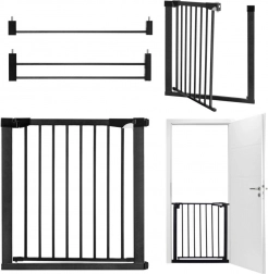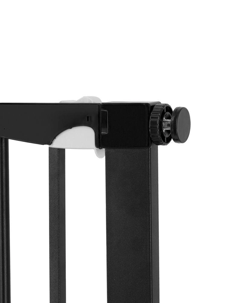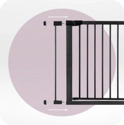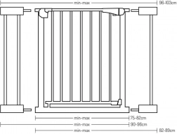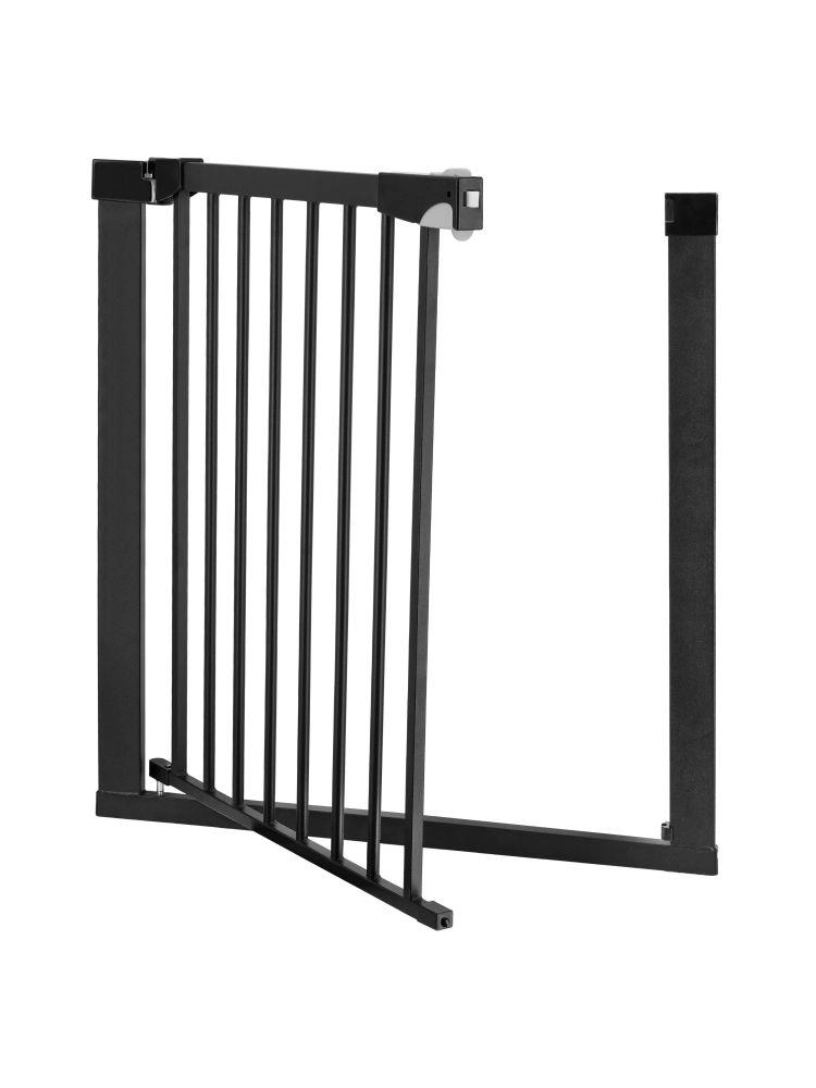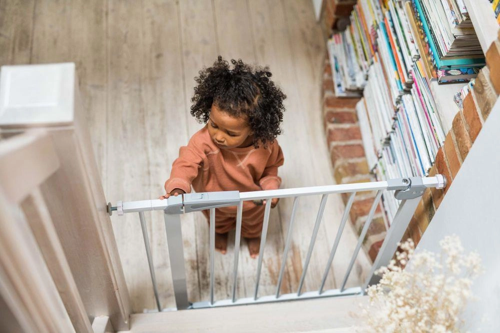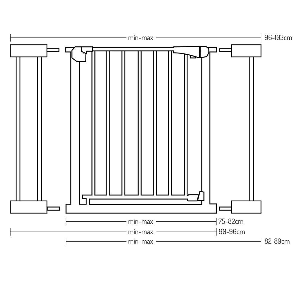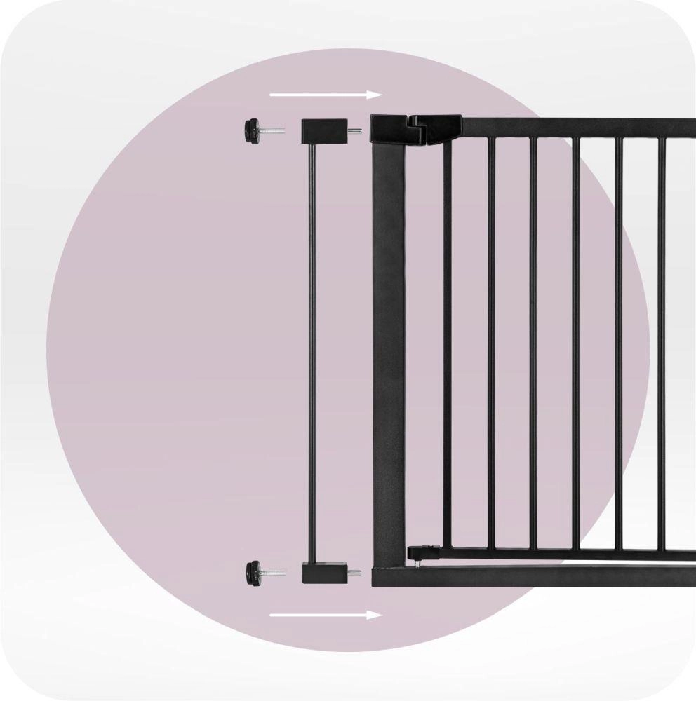 De basisbreedte van 75–82 cm en de meegeleverde verlengstukken van 7 cm en 14 cm maken uitbreiding tot 103 cm mogelijk. Het hekje opent in beide richtingen, heeft praktische vergrendeling en blijft bij 90° open voor een comfortabele doorgang. Het dubbele vergrendelingssysteem voorkomt dat kinderen het zelfstandig openen.