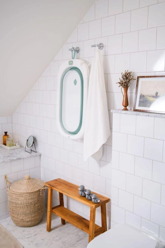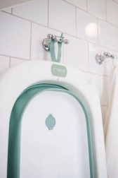 In enkele seconden vouw je het badje plat tot een hoogte van ongeveer 10 cm. Ideaal voor kleine badkamers en op reis – hang het aan een haak en het is opgeruimd.