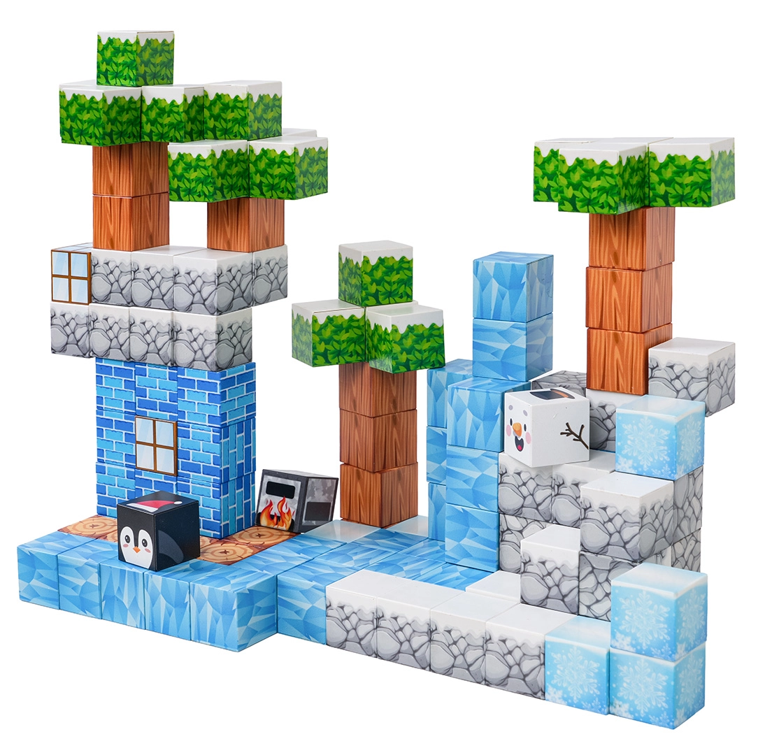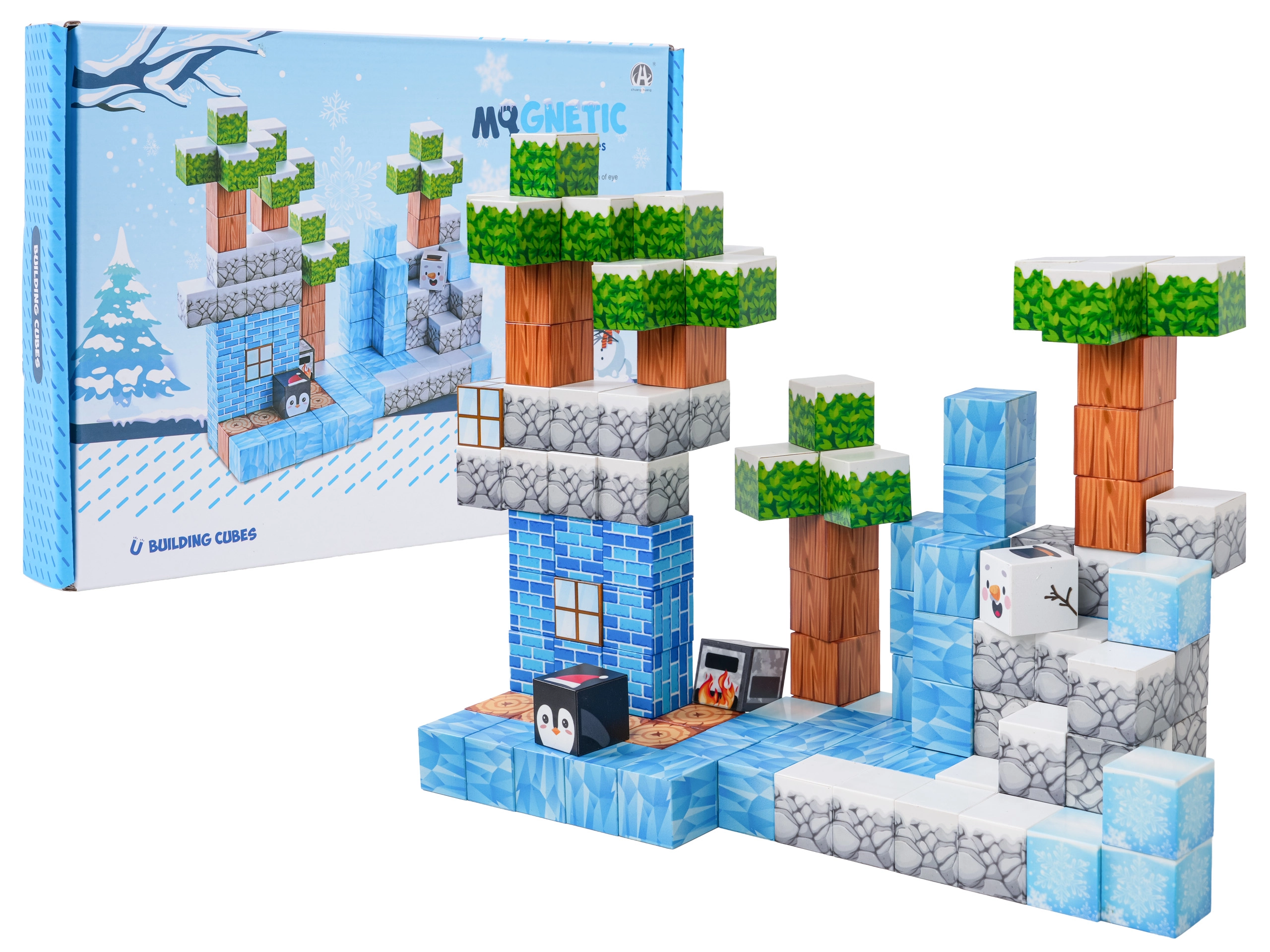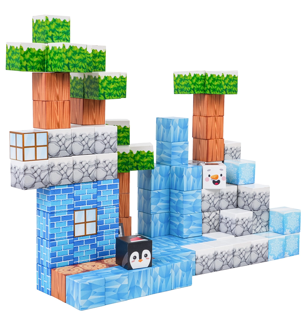 Deze uitgebreide bouwset biedt kinderen eindeloze bouwmogelijkheden – van winterse taferelen tot originele terreinen en bouwwerken. De blokken met gedrukte texturen (ijs, hout, steen, baksteen, groen) verbinden veilig en stevig dankzij neodymiummagneten, waardoor modellen hun vorm behouden, ook tijdens langdurig spelen.
