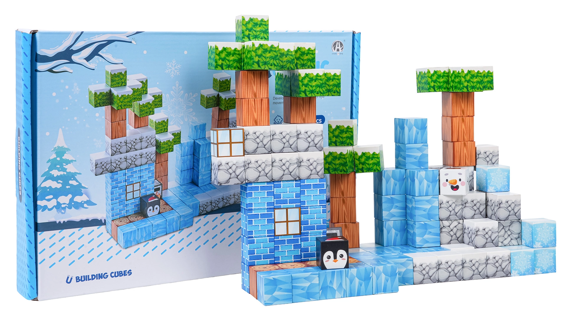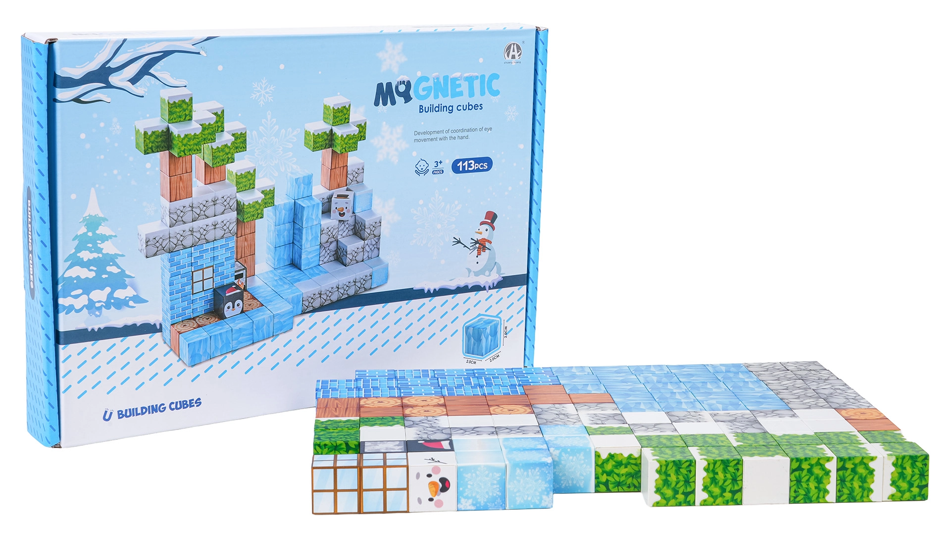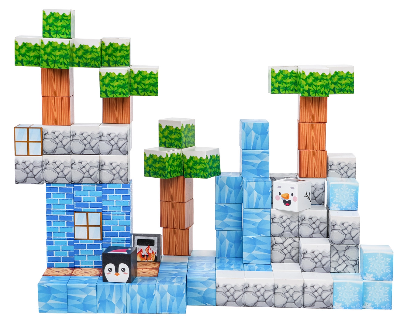 Deze uitgebreide bouwset biedt kinderen eindeloze bouwmogelijkheden – van winterse taferelen tot originele terreinen en bouwwerken. De blokken met gedrukte texturen (ijs, hout, steen, baksteen, groen) verbinden veilig en stevig dankzij neodymiummagneten, waardoor modellen hun vorm behouden, ook tijdens langdurig spelen.