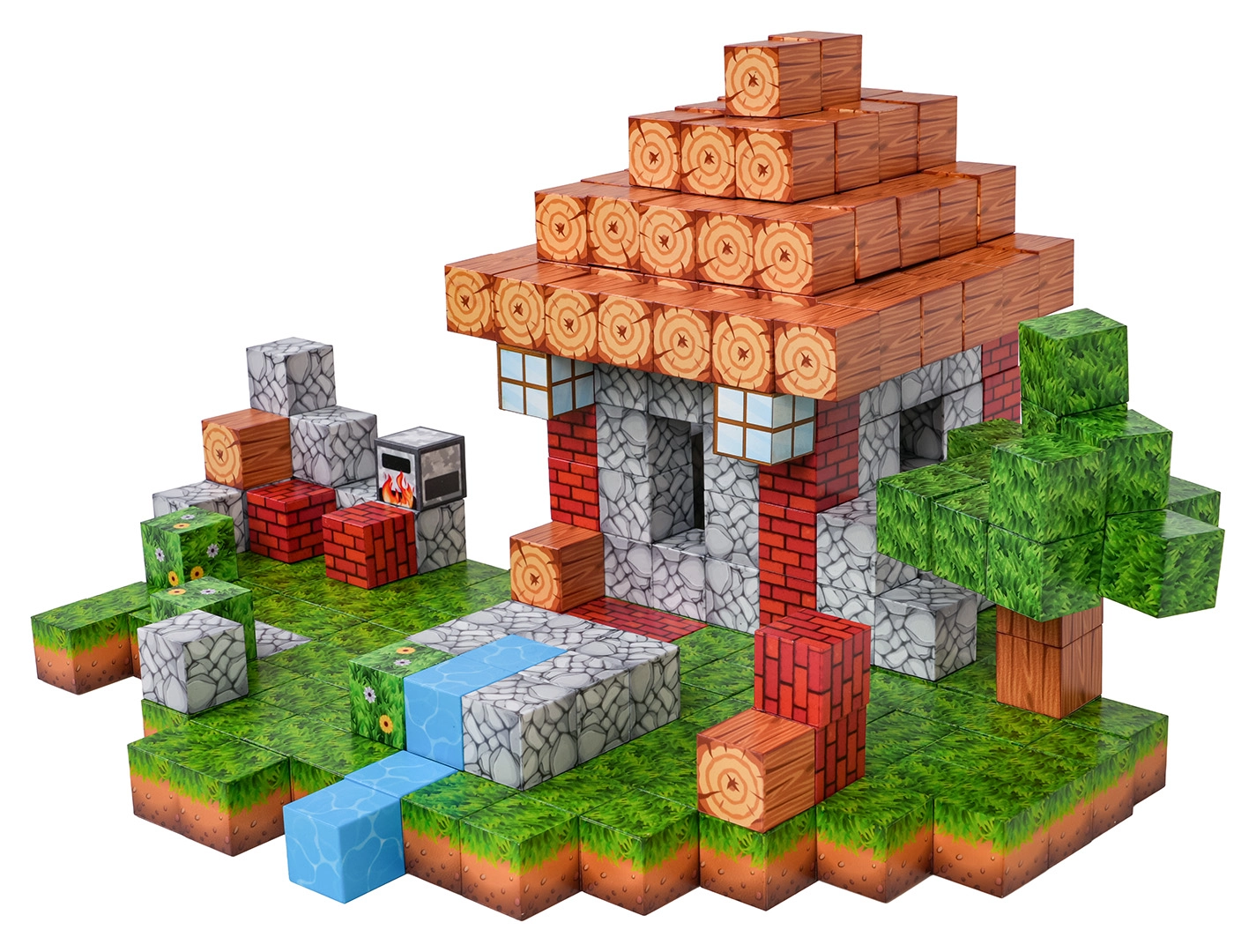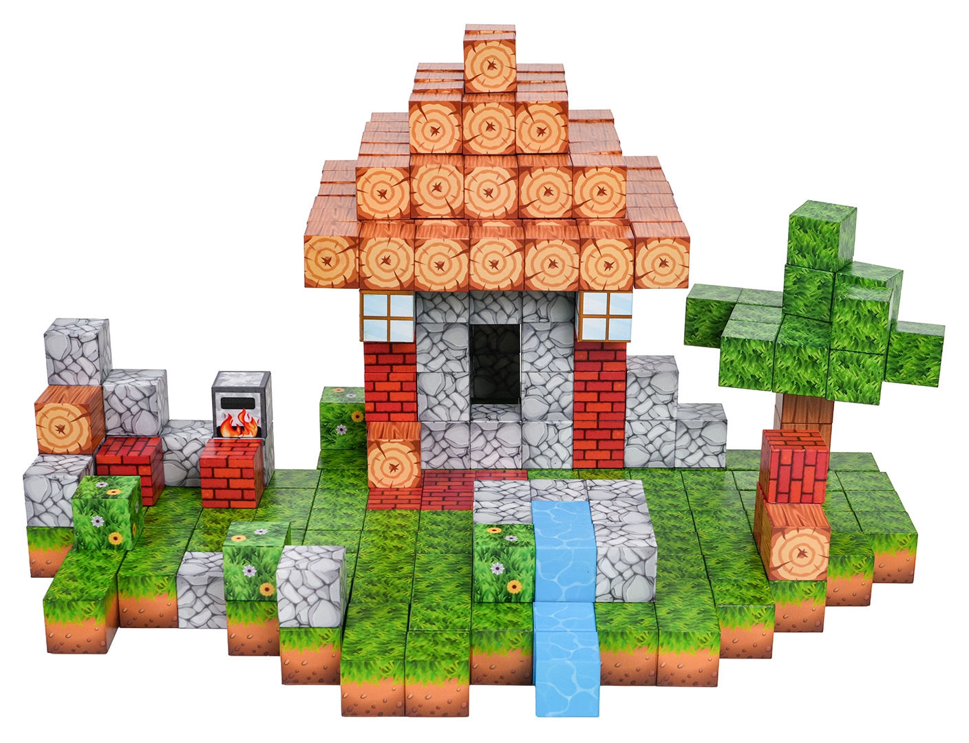 Het grote aantal blokjes met diverse prints maakt het mogelijk om uiteenlopende scènes te bouwen – van een huisje met tuin tot een beekje en een pixelachtig landschap.