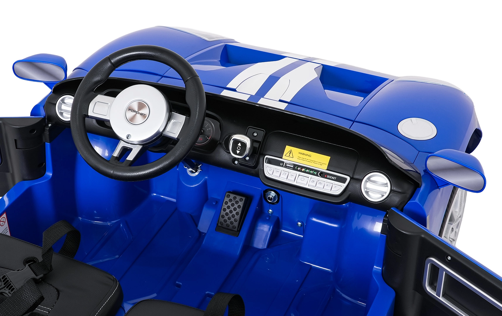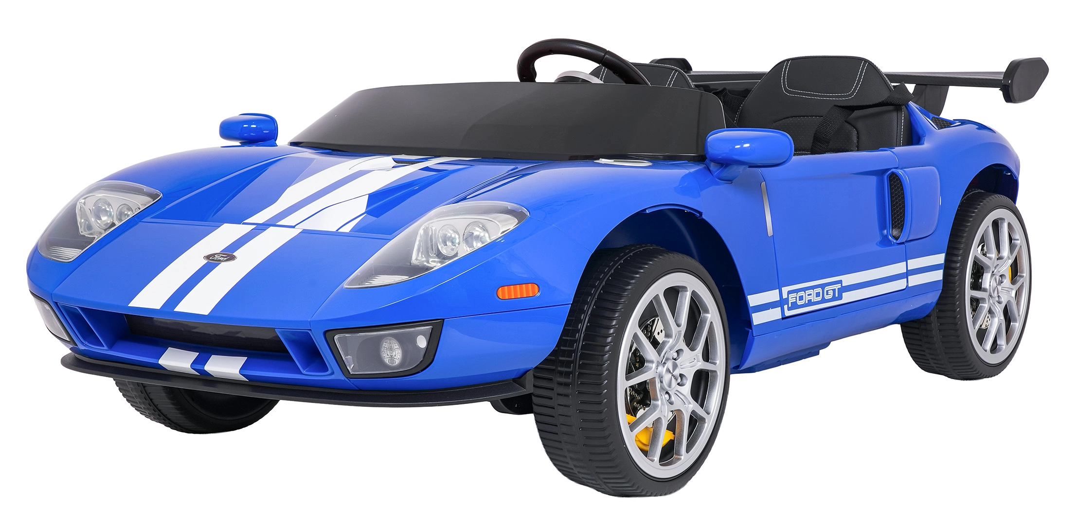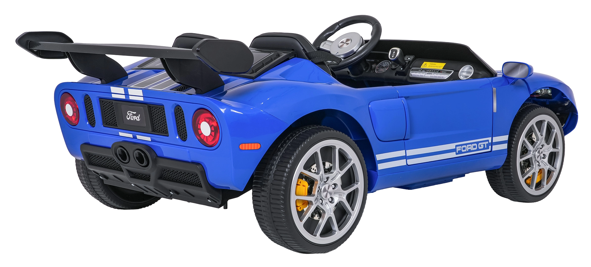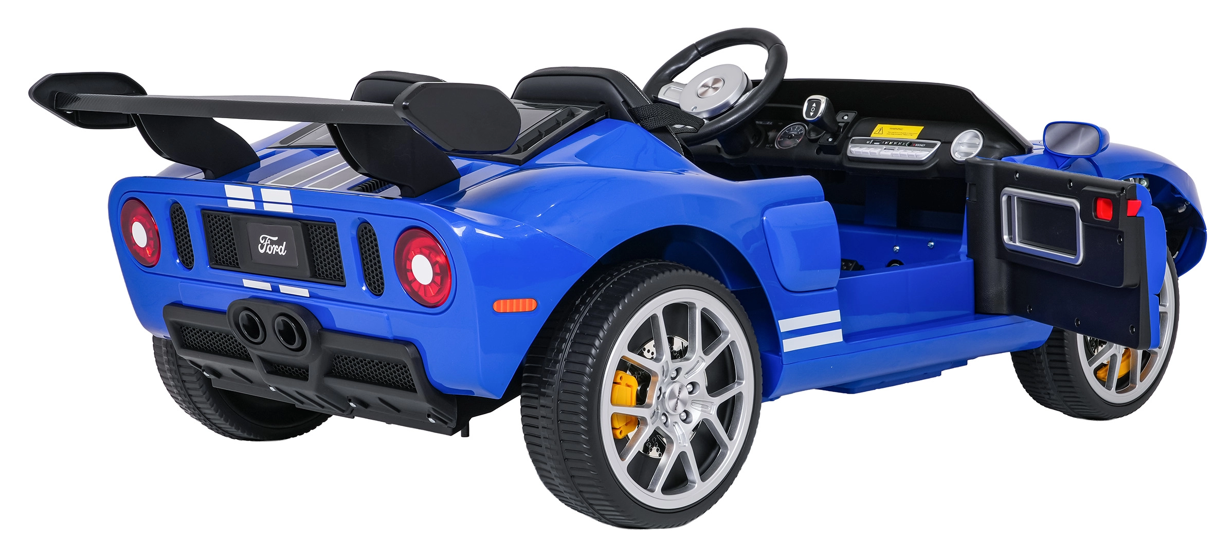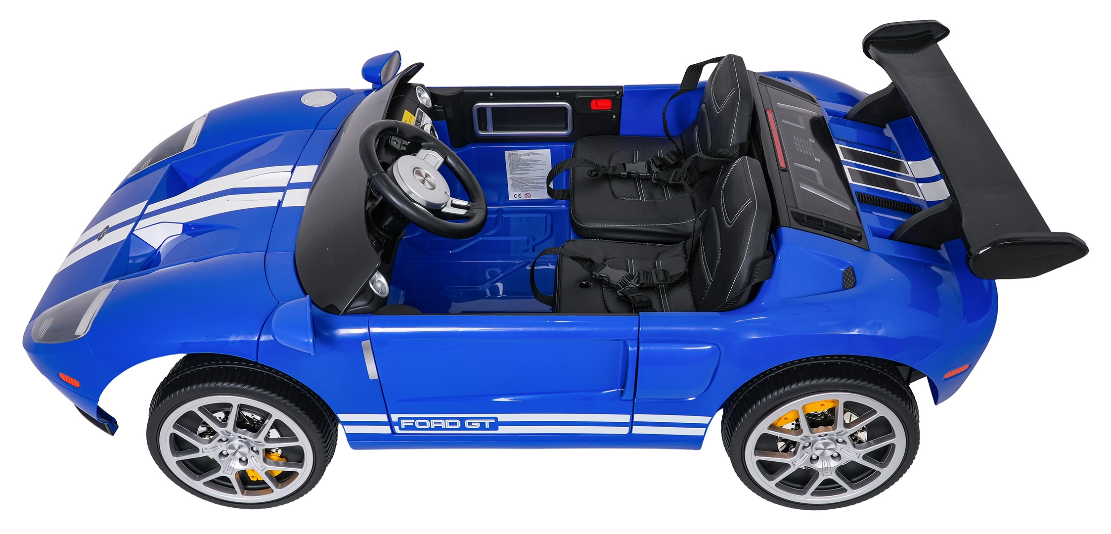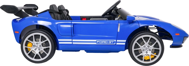 Stijlvolle elektrische kinderauto FORD GT in het blauw met een krachtige aandrijving 4x100 W, 24 V 7 Ah accu, twee stoelen van eco-leer met gordels en zachte EVA-wielen voor comfortabel rijden. Ouders waarderen de 2,4 GHz afstandsbediening met een noodstopknop, kinderen vinden de LED-verlichting, FM-radio, MP3, Bluetooth en USB op het dashboard geweldig.