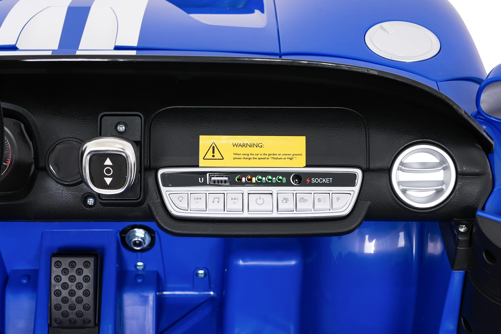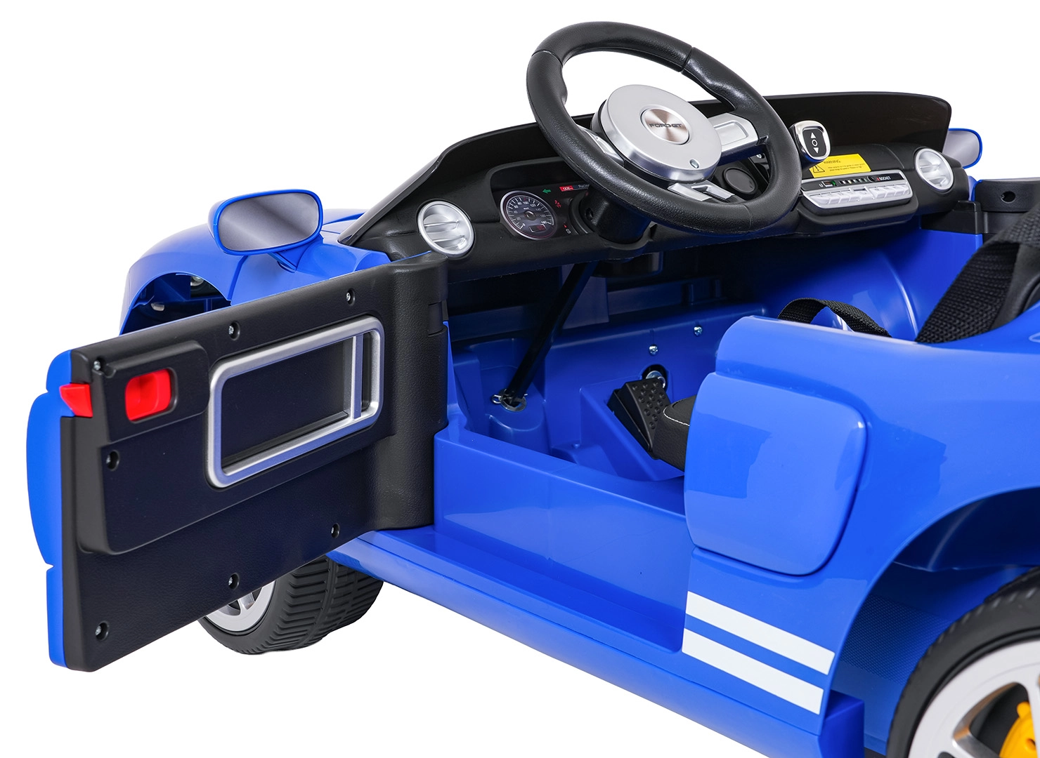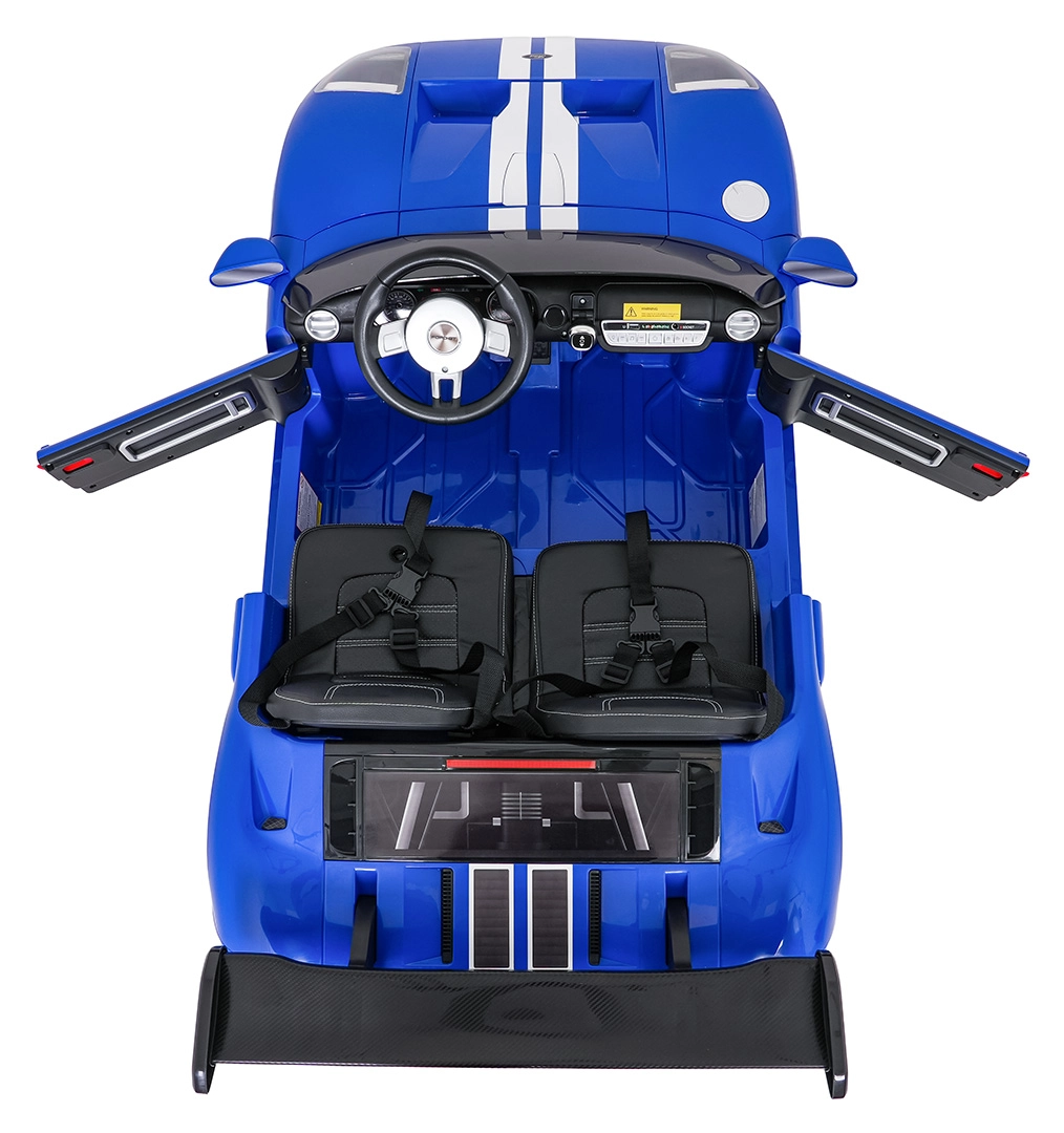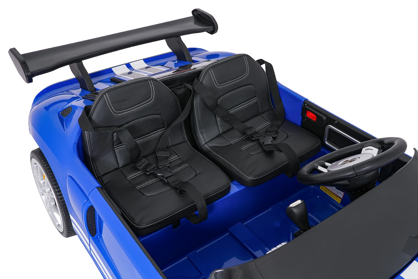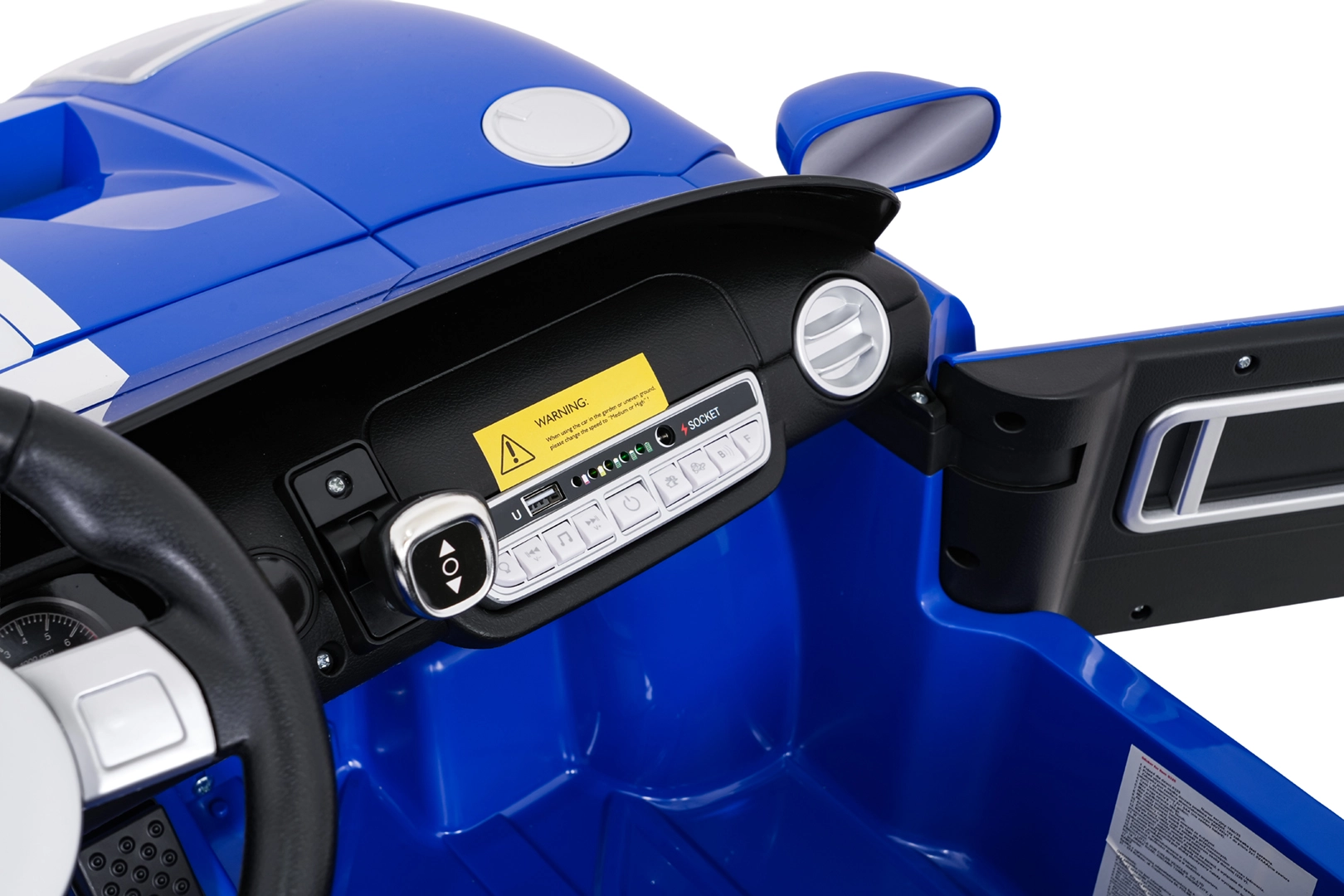 Stijlvolle elektrische kinderauto FORD GT in het blauw met een krachtige aandrijving 4x100 W, 24 V 7 Ah accu, twee stoelen van eco-leer met gordels en zachte EVA-wielen voor comfortabel rijden. Ouders waarderen de 2,4 GHz afstandsbediening met een noodstopknop, kinderen vinden de LED-verlichting, FM-radio, MP3, Bluetooth en USB op het dashboard geweldig.