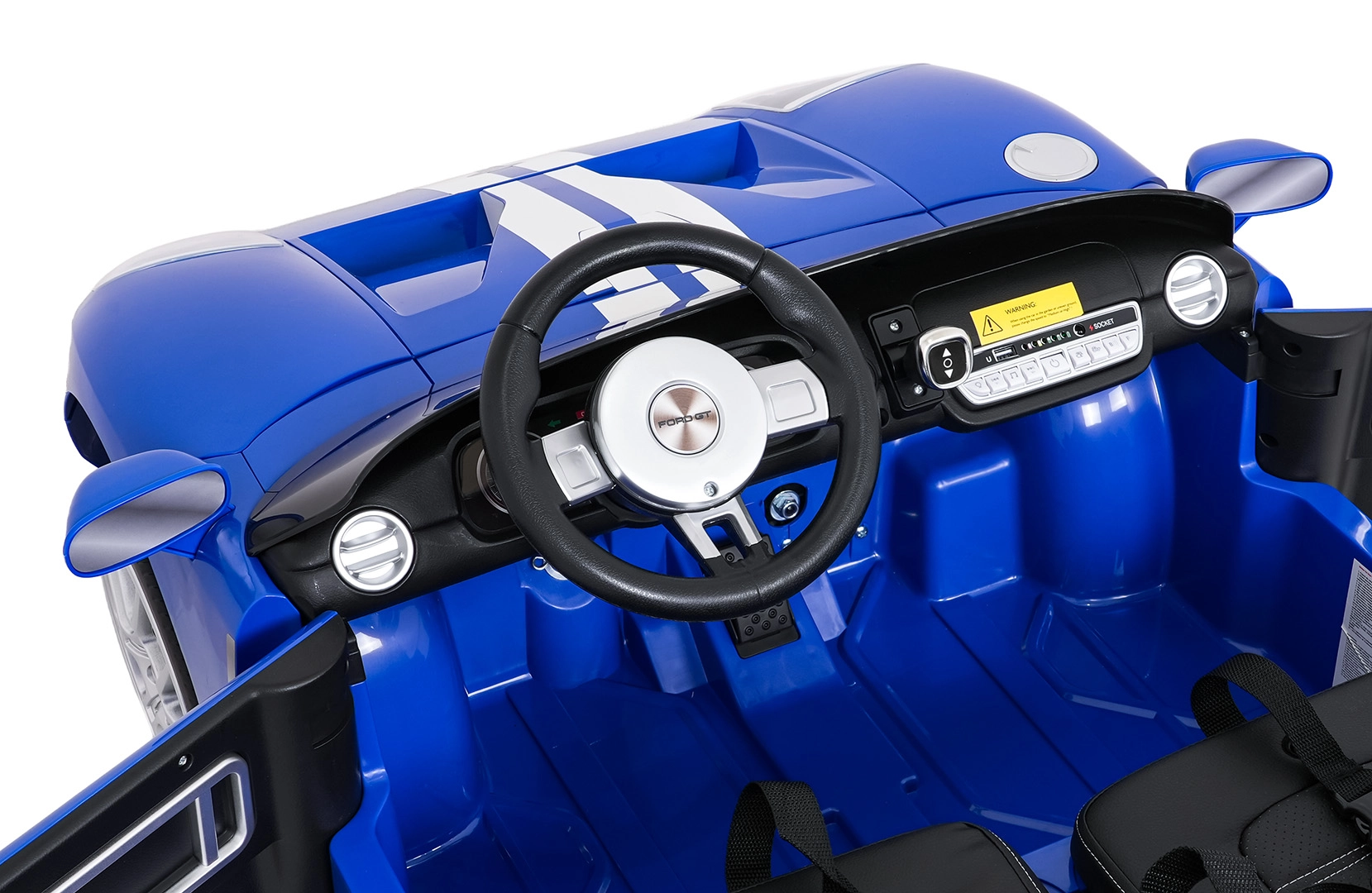 Het interieur verrast met twee aparte stoelen van eco-leer met veiligheidsgordels, een functioneel audiopaneel (FM, MP3, Bluetooth, USB) en een duidelijke laadstatus-indicator. Voorlampen met LED en een lichtschakelaar zijn vanzelfsprekend. De 2,4 GHz ouderafstandsbediening met drie snelheden en een veiligheidsschakelaar Stop biedt maximale controle in elke situatie.
