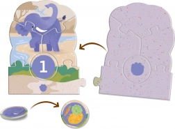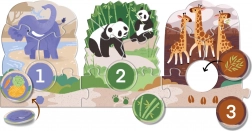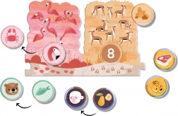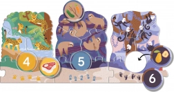 Dit originele educatieve spel leert kinderen vanaf 2 jaar dieren herkennen, hun sporen en hun voeding, en traint tegelijk het eerste tellen van 1 tot 10. De lange puzzels met dierenverblijven worden aangevuld met de juiste fiches volgens aantal, spoor of voedsel, waardoor aandacht, sorteren en associaties worden geoefend.