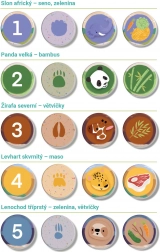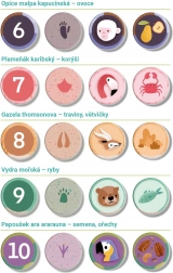 Ronde fiches met voedsel en dierenkopjes helpen kinderen juist te koppelen wat elk dier eet en welke sporen het achterlaat.