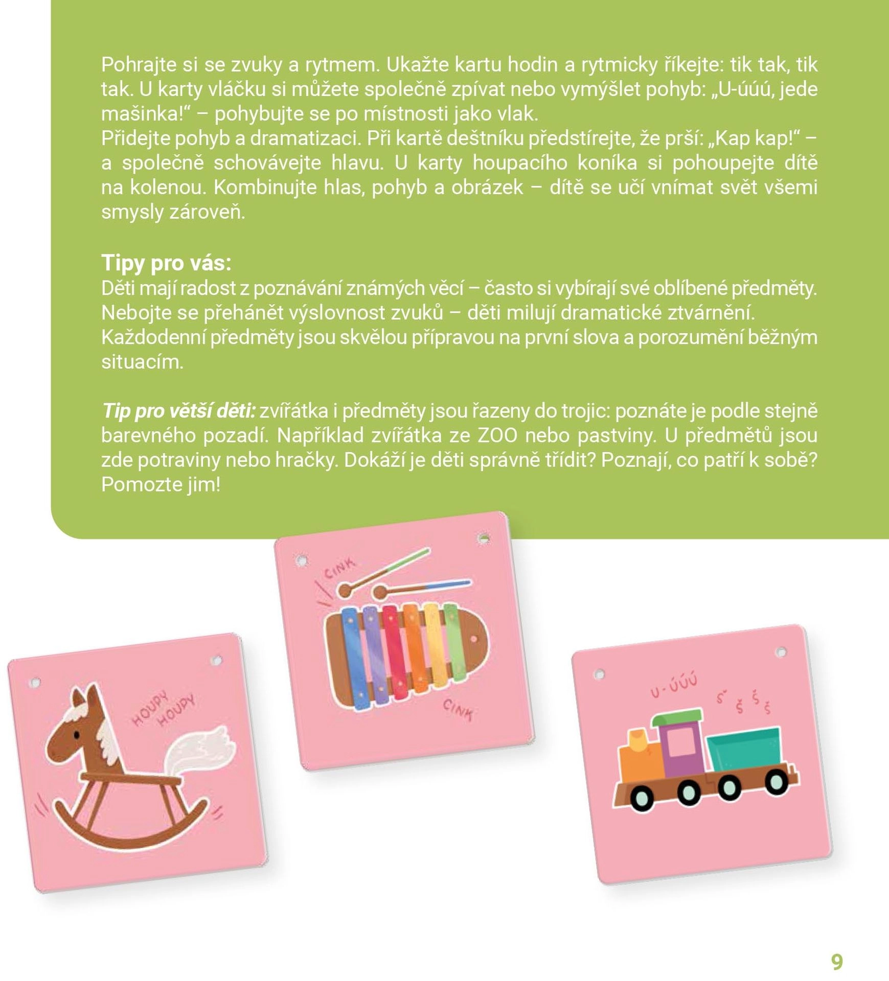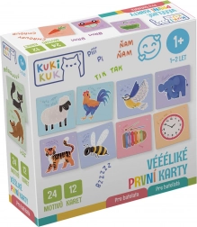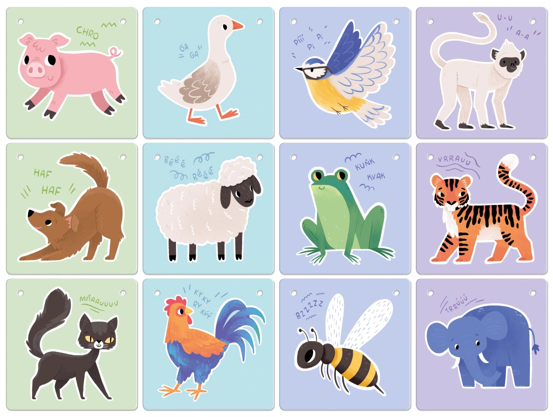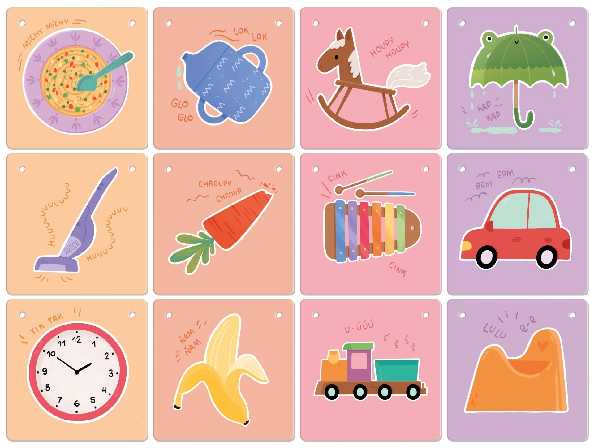 In de periode van 12–30 maanden wordt de spraakontwikkeling het sterkst beïnvloed door het nabootsen van geluiden. Het herhalen van geluiden versterkt de mondmotoriek (lippen, tong, zacht gehemelte), helpt de melodie en het tempo van de taal te ervaren en vormt de basis voor de woordenschat. De kaarten dienen zo uitstekend als brug van geluiden naar de eerste woorden.