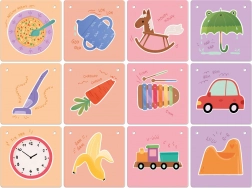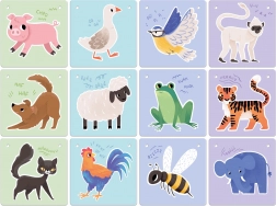 Deze set grootformaat kaarten is ontworpen voor speelse stimulatie van spraak in de periode waarin kinderen eerst geluiden imiteren en pas daarna woorden vormen. Heldere, begrijpelijke illustraties met grafische aanwijzingen motiveren kinderen om geluiden als “miauw”, “brom” of “waf” te herhalen, waarmee ze op natuurlijke wijze auditieve discriminatie, geheugen en het ritme van de taal trainen.