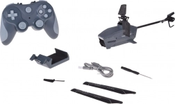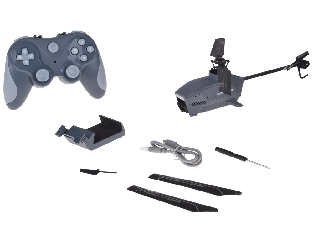 - Helikopter, controller, accu, USB-kabel, reservebladen, staartrotor, telefoonhouder, schroevendraaier, handleiding