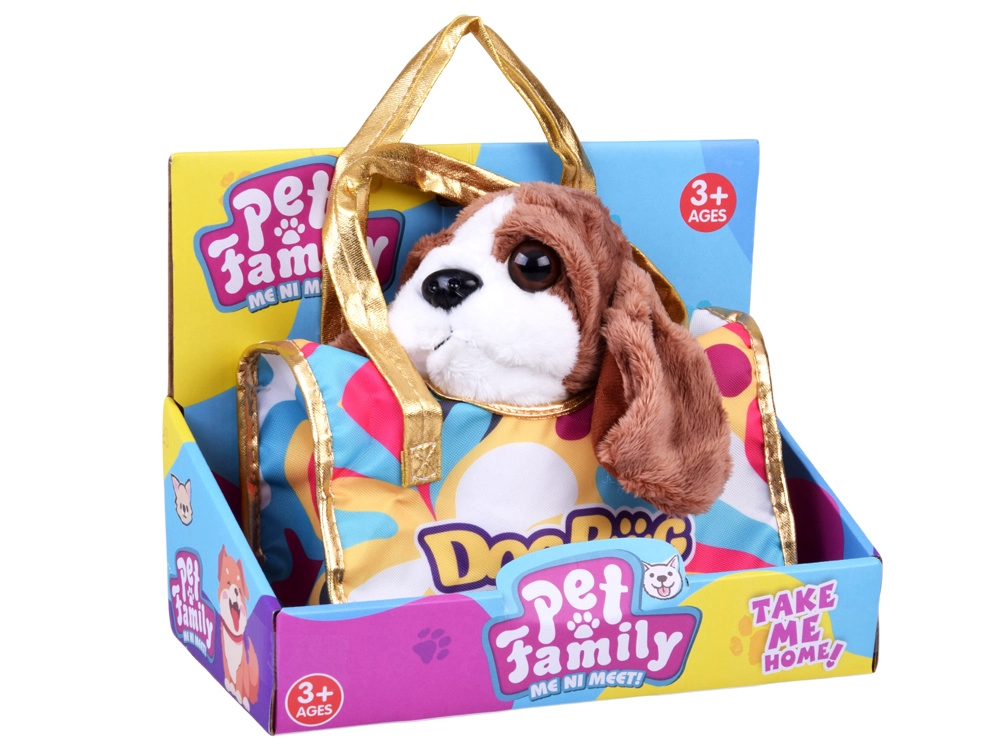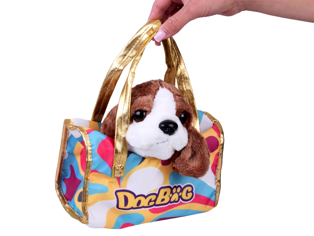 De kleurrijke handtas met gouden hengsels laat kinderen het hondje overal mee naartoe nemen – voor een wandeling, naar de opvang of op reis.