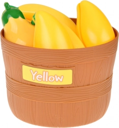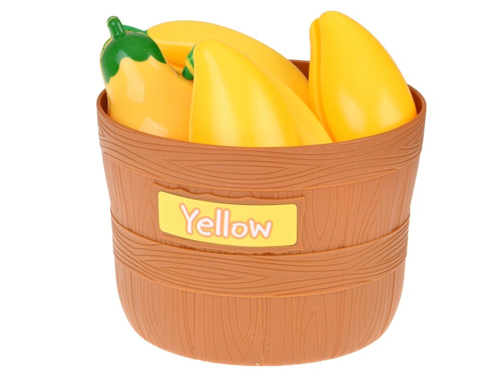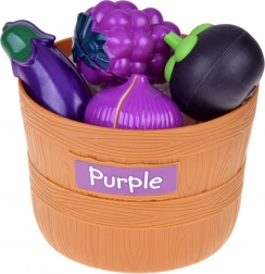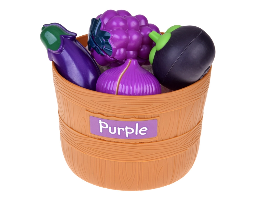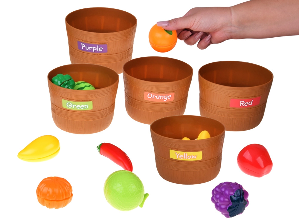 Vijf mandjes met gekleurde labels motiveren kinderen om voedingsmiddelen op kleur te sorteren. Een geweldige basis voor vroege perceptie en de ontwikkeling van logisch denken.