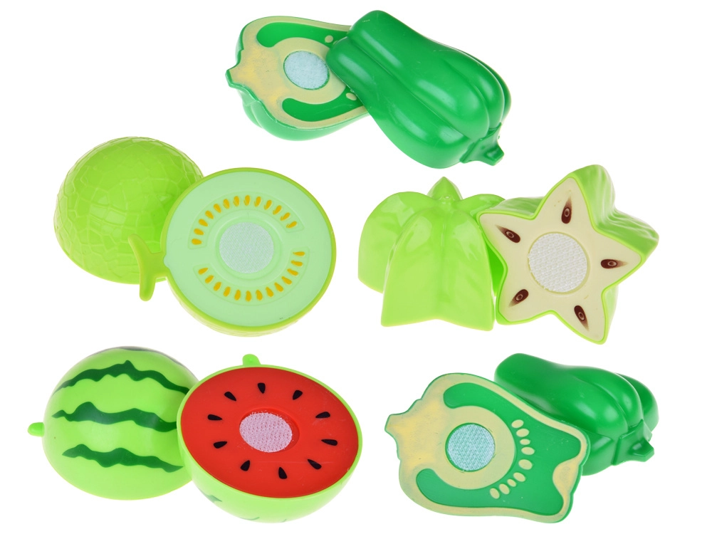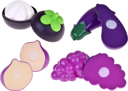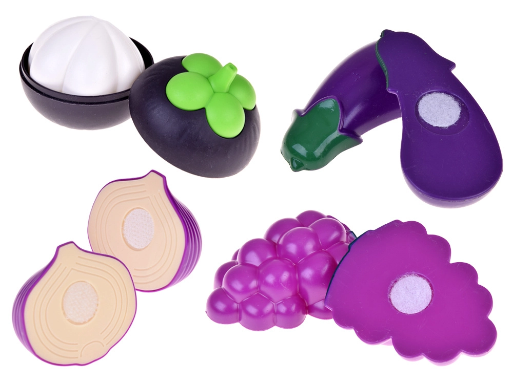 Deze grote set kinderspeelgoed-eten van plastic combineert plezier en leren. Kinderen kunnen stukjes in tweeën “snijden” en dankzij klittenband weer samenvoegen, ze op kleur in mandjes sorteren en spelenderwijs de namen van fruit en groenten leren. Realistische vormen en heldere kleuren nodigen uit tot ontdekken en tot pretend play in de kinderkitchen.