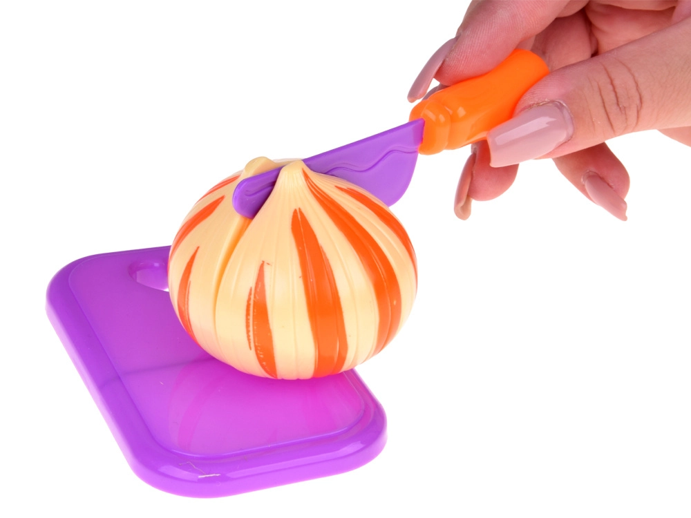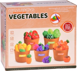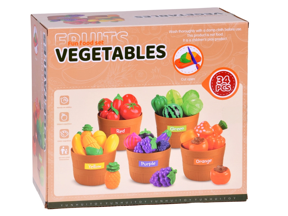 Speelse en educatieve set voor kleine koks: plastic fruit en groenten met klittenband, kleurrijke mandjes en accessoires voor sorteren. Ondersteunt de ontwikkeling van de fijne motoriek, kleuren leren en het herkennen van soorten fruit en groenten. Veilig “snijden” op een snijplank met messen zorgt voor realistisch kookspel en heel veel plezier.