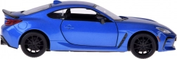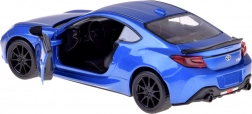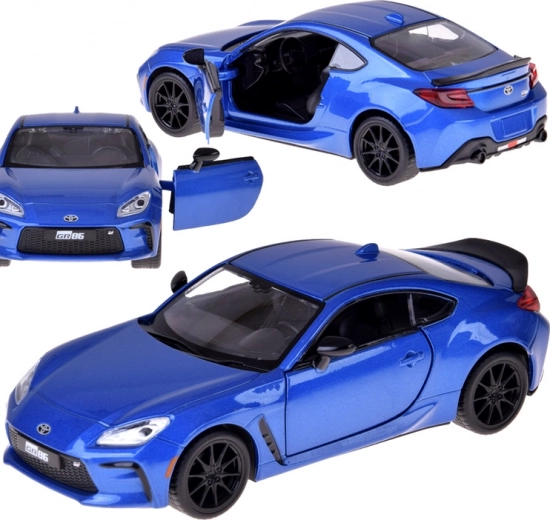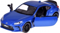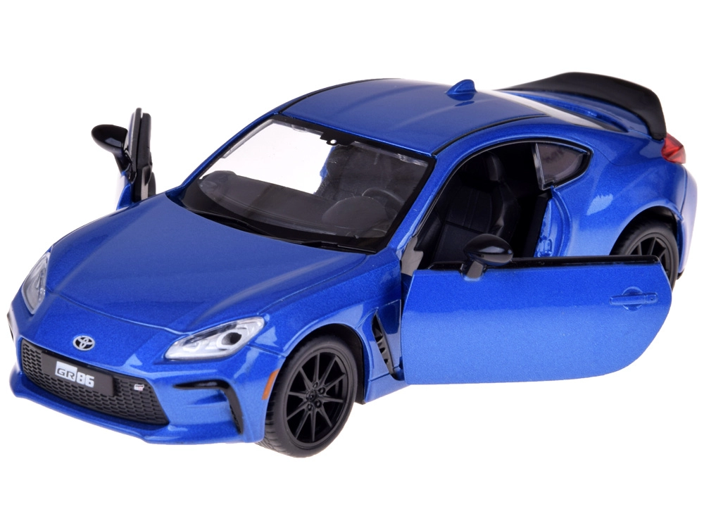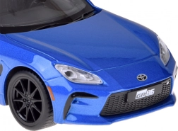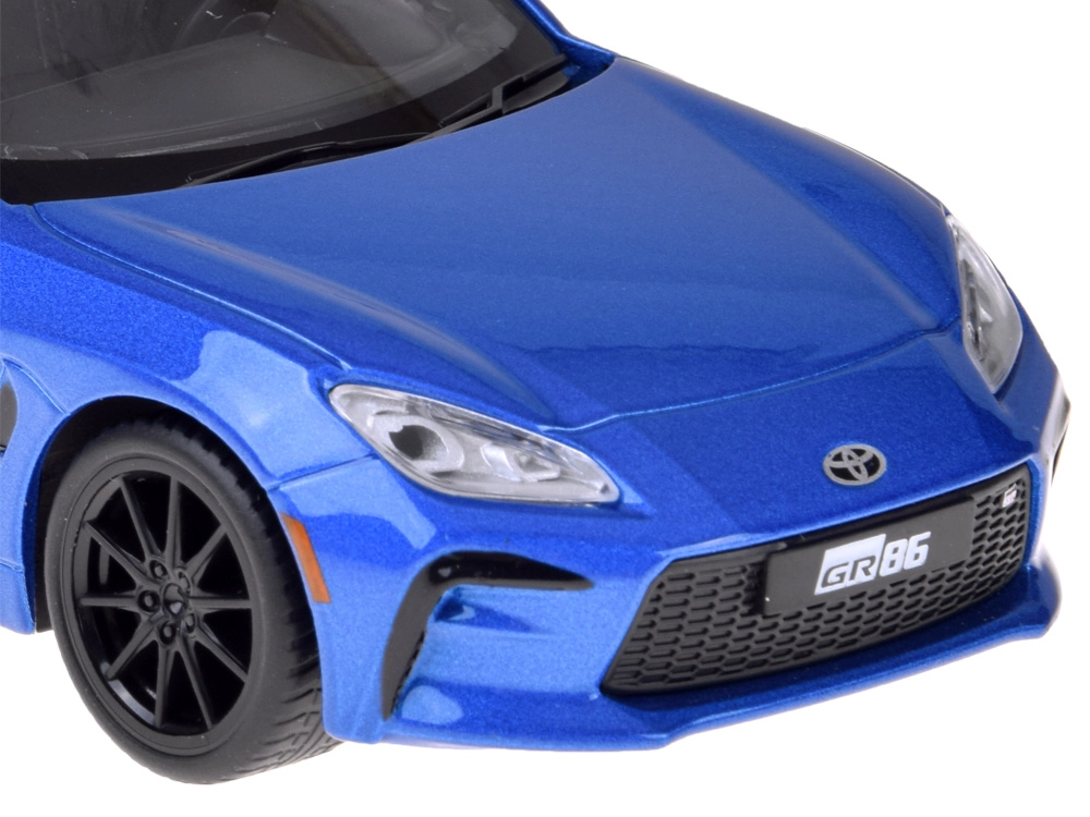 Het gedetailleerde model TOYOTA GR86 in aantrekkelijke blauwe metallic lak verrast met hoogwaardige afwerking en realistische verhoudingen. De metalen carrosserie met kunststof chassis en rubberen wielen zorgt voor een vloeiende en stille beweging, terwijl openende deuren de verlichting en motor- en claxongeluiden activeren.