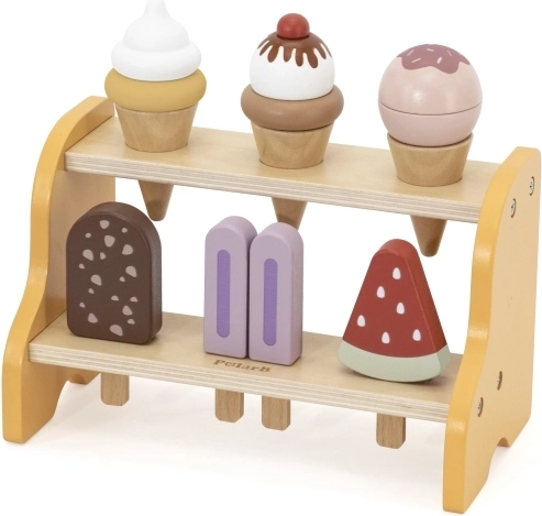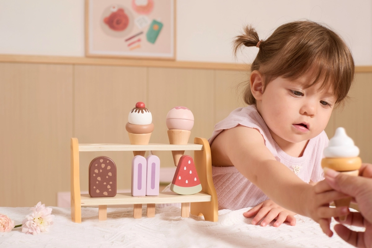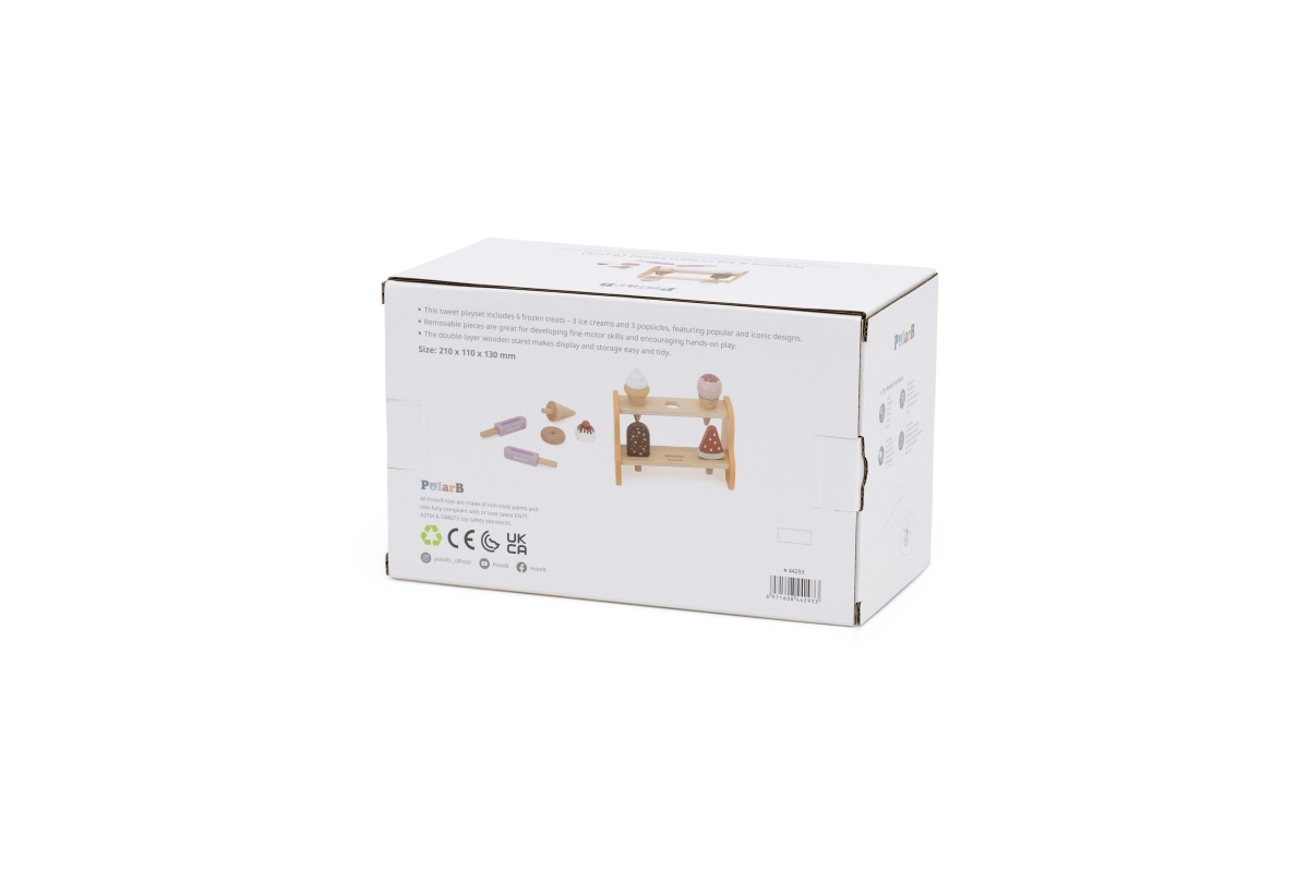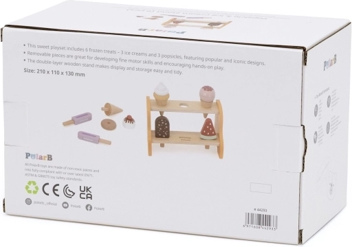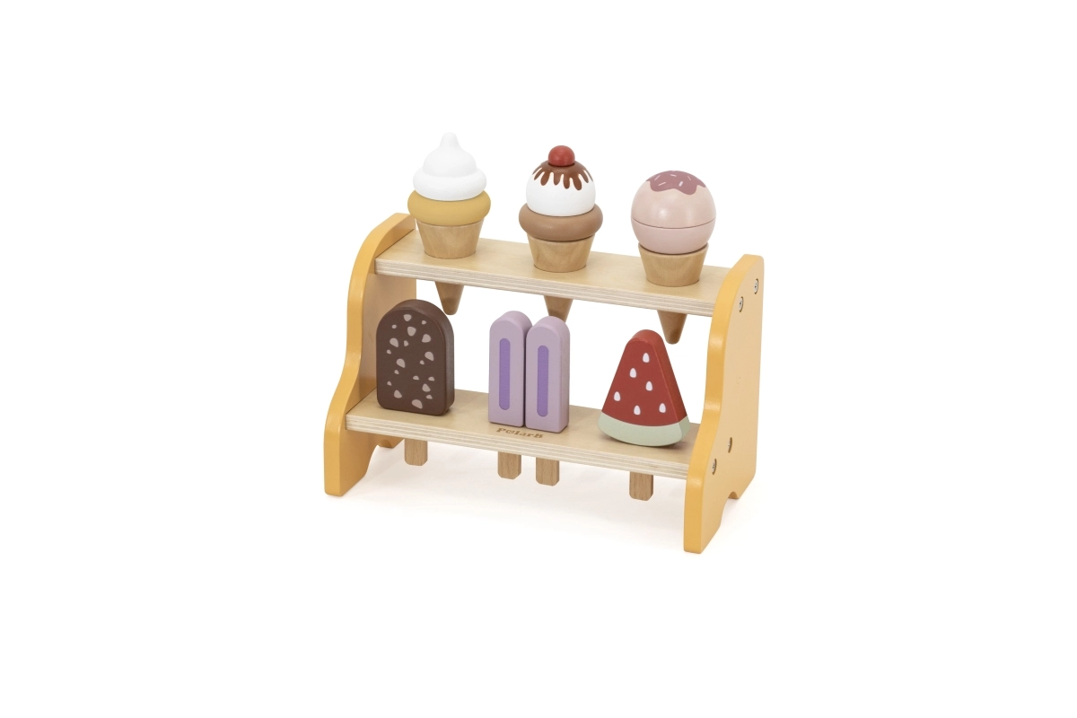 De praktische standaard met twee niveaus houdt alle hoorntjes en ijslolly’s op hun plek. Kinderen leren op een natuurlijke manier sorteren, opruimen en het “assortiment” presenteren zoals in een echte ijssalon.