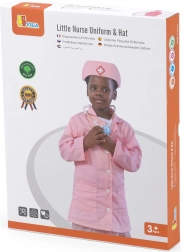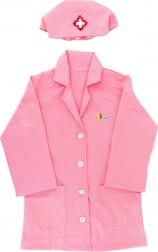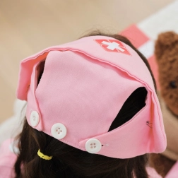 Inclusief bijpassende roze muts met opvallend kruis die de rol van een kleine verpleegster benadrukt.