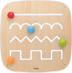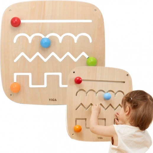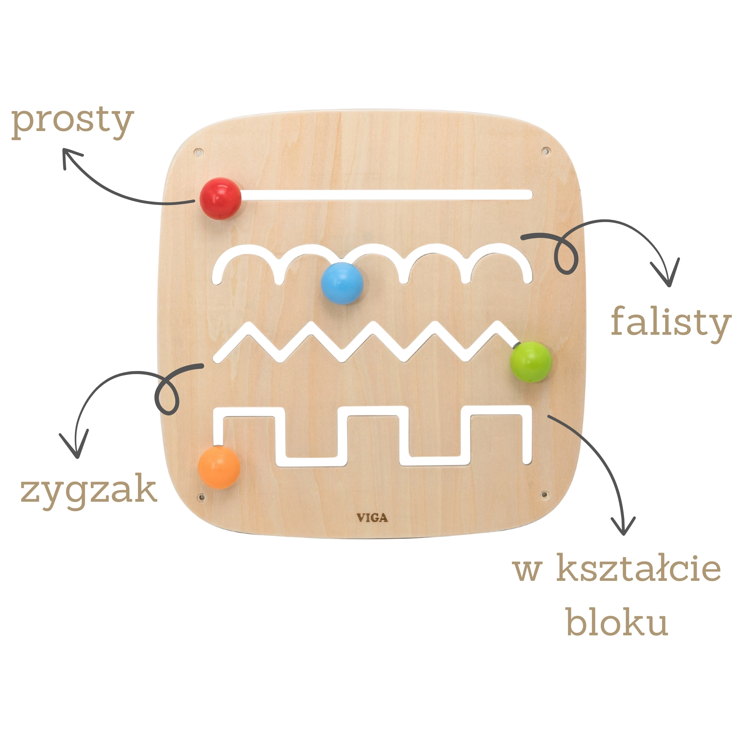 Het houten VIGA-paneel verandert dagelijks spelen in een betekenisvolle activiteit. Kinderen schuiven kralen over verschillende banen, verkennen rechten, golven, zigzags en blokvormen, trainen hun greep en bewegingsprecisie en leren begrippen als krommen en hoeken. Natuurlijk hout, afgeronde hoeken en stevige bevestiging zorgen voor veiligheid bij elke aanraking.