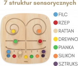 Zeven unieke texturen en felle kleuren stimuleren kinderen om oppervlakken, kleuren en vormen te onderscheiden, waardoor zintuiglijke waarneming en concentratie op een natuurlijke manier worden versterkt.