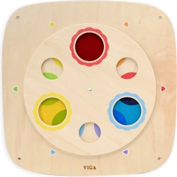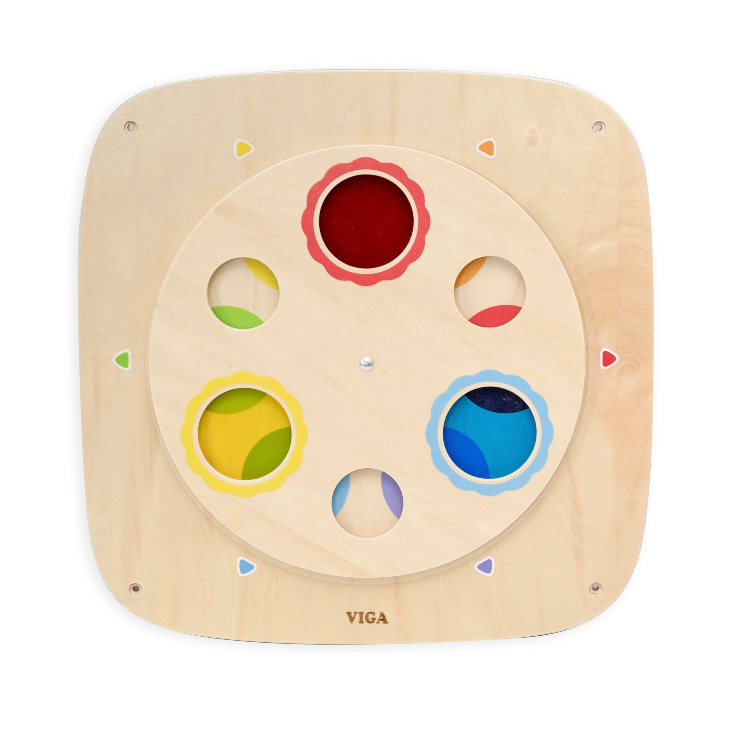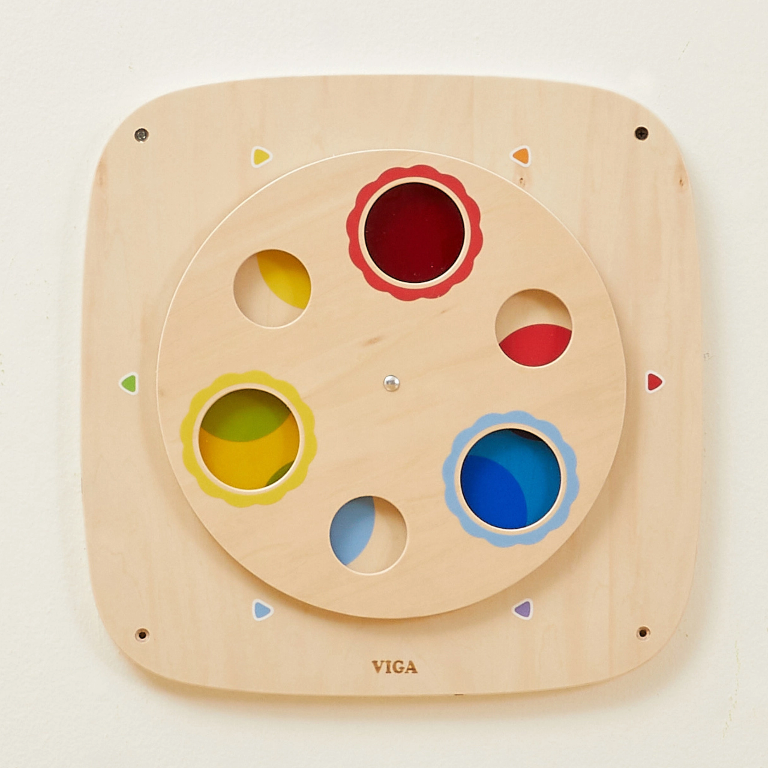 Dit hoogwaardige houten wandbord van VIGA brengt op speelse wijze het leren van kleurentheorie. Het draaiende ronde paneel met transparante gekleurde venstertjes laat kinderen kleuren vergelijken, over elkaar leggen en nieuwe tinten ontdekken. Dankzij de robuuste uitvoering is het bord ideaal voor thuis, kleuterscholen en speelhoeken.