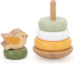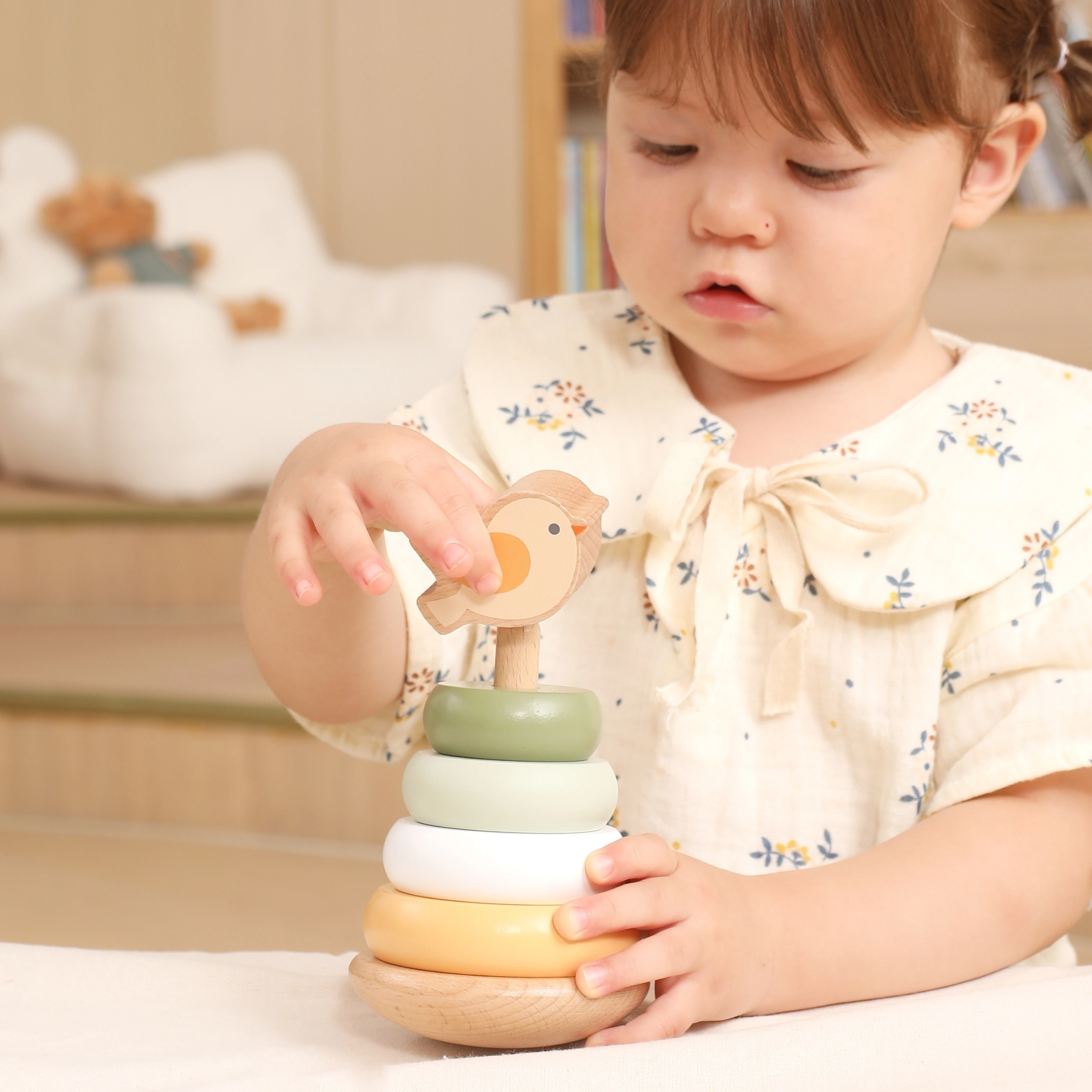 De houten stapeltoren met een schattig vogeltje bovenop zal elk peutertje blij maken. De gekleurde ringen met gladde randen zijn gemakkelijk vast te pakken en in verschillende volgordes te stapelen, wat onderscheiden van kleuren en maten en probleemoplossend denken bevordert. De stabiele basis en prettig afgeronde vormen zorgen voor veilige hantering door kleine handjes.