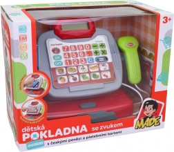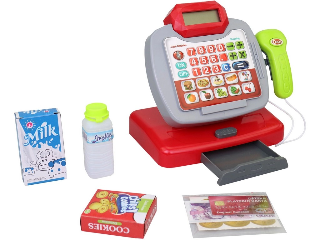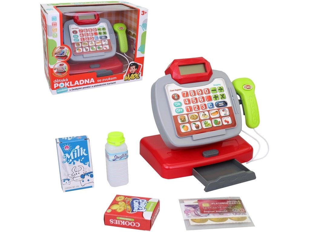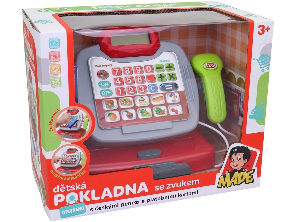 Een kinder-kassa met Tsjechisch design die alle kleine verkopers zal verrassen. Biedt licht- en geluidseffecten, een werkende scanner voor het scannen van prijzen, een digitale rekenmachine en veel accessoires, inclusief Tsjechisch papiergeld, betaalkaarten en plastic munten. Voeding via 2× AA-batterijen (inbegrepen). Geschikt voor kinderen vanaf 3 jaar.