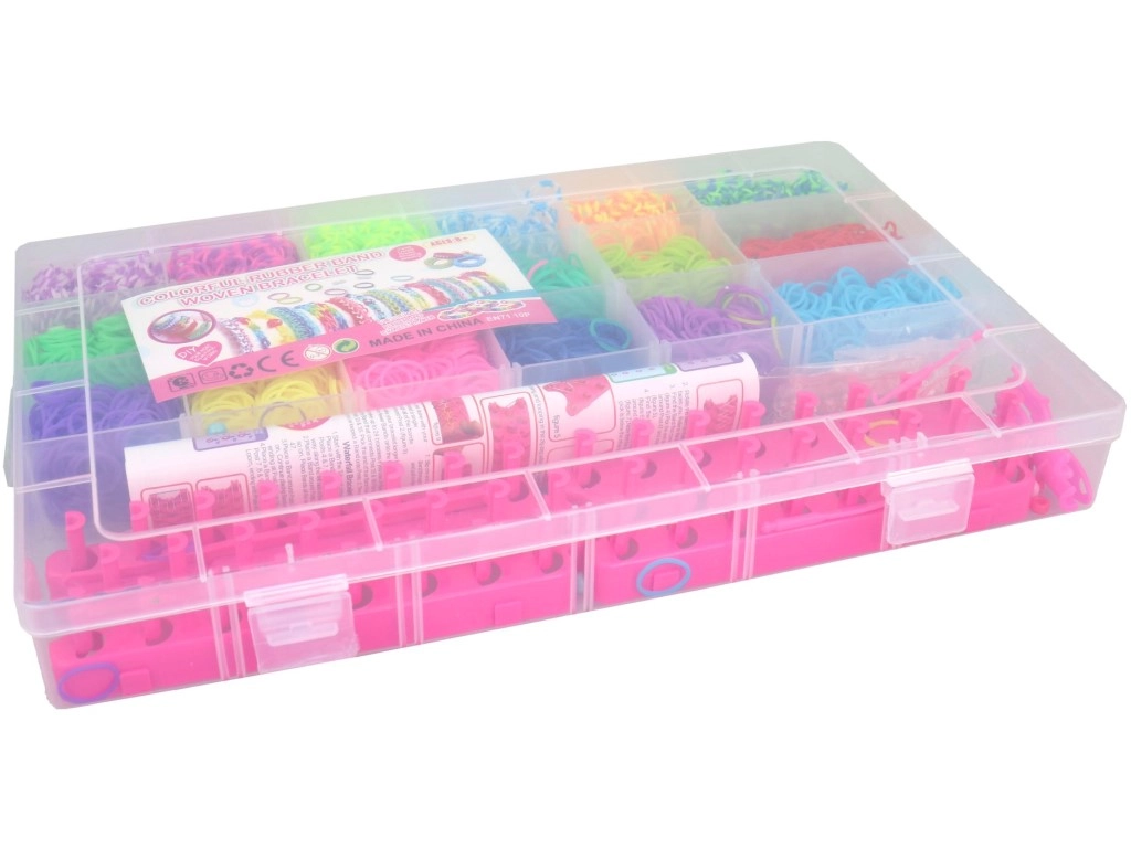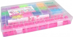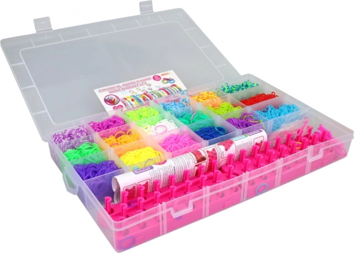 Creatieve set weefelastiekjes in een praktische box met 18 vakken voor overzichtelijke opslag van kleuren. Bevat een weefstandaard en alles wat nodig is voor het maken van armbandjes, ringetjes, figuurtjes en hangers. De transparante behuizing zorgt ervoor dat je altijd snel de juiste tint vindt en de vakken voorkomen vermenging. Ideaal voor de ontwikkeling van de fijne motoriek en de fantasie van kinderen. Heldere kleuren, praktische organizer en rijk accessoirespakket voor eindeloos knutselplezier.