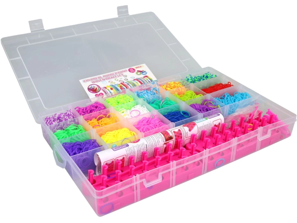 Met deze set weefelastiekjes beleven kinderen en beginnende makers urenlang plezier. Dankzij de overzichtelijke box met 18 vakken heb je de afzonderlijke kleuren altijd bij de hand, zonder rommel of mengen. Het transparante deksel maakt snelle oriëntatie en eenvoudig meenemen mogelijk.