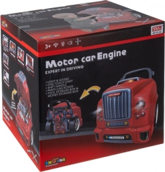 - Auto met motor om uit elkaar te halen, bewegende onderdelen onder de motorkap, schroevendraaier, sleutels, schroeven, montageonderdelen, handleiding, kleurrijke verpakking, transportdoos