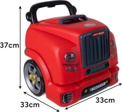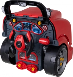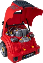 Complete mechanische werkplaats voor kinderen vanaf 3 jaar met een rode auto met te openen motorkap, gedetailleerde “motor”, bedienelementen en kindergereedschap. Dankzij schroeven, wielen en bewegende onderdelen oefenen kinderen hun coördinatie en begrijpen ze de basis van hoe een voertuig werkt in een veilige en leuke omgeving.