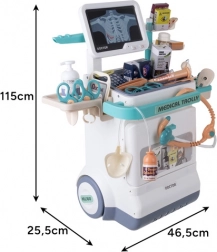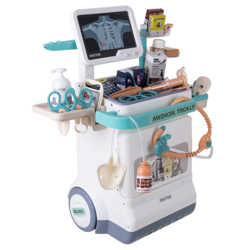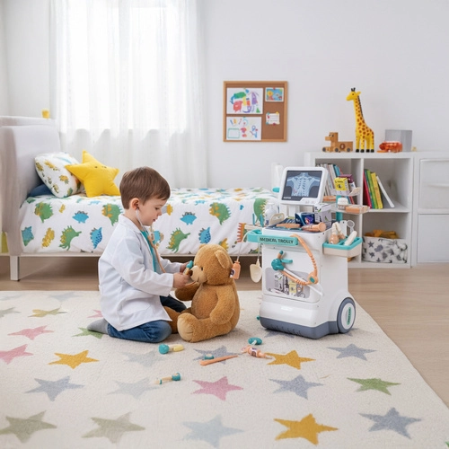 Het verrijdbare kinder-dokterstation brengt realistisch doktertje spelen in huis. De tweelaagse kar met wieltjes, ECG/rtg‑scherm en rijke uitrusting laat kinderen voor patiënten zorgen – knuffels én familieleden. Licht- en geluidseffecten (hartslag, ECG‑signaal) prikkelen de nieuwsgierigheid en laten zien hoe een praktijk werkt.
