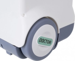 De kar met wieltjes en neerklapbare deurtjes/blad maakt het verplaatsen tussen “spreekkamers” makkelijk en houdt de instrumenten overzichtelijk opgeborgen en altijd binnen handbereik.