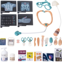 Stethoscoop, instelbare thermometer, spuit, schaar, pincet, scalpel, spiegeltje, hamertje, flesjes, “medicijnen” en röntgen/ECG‑beelden – alles voor kleine dokters.