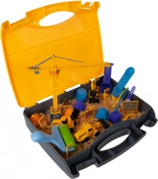 - Beweegbare kraan, 3 bouwvoertuigen (2 laders/schuivers, 1 graafmachine), 3 modelleerspatels, vormpjes en accessoires