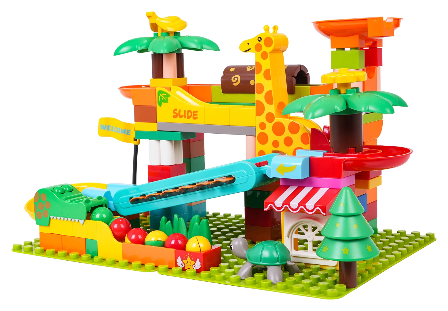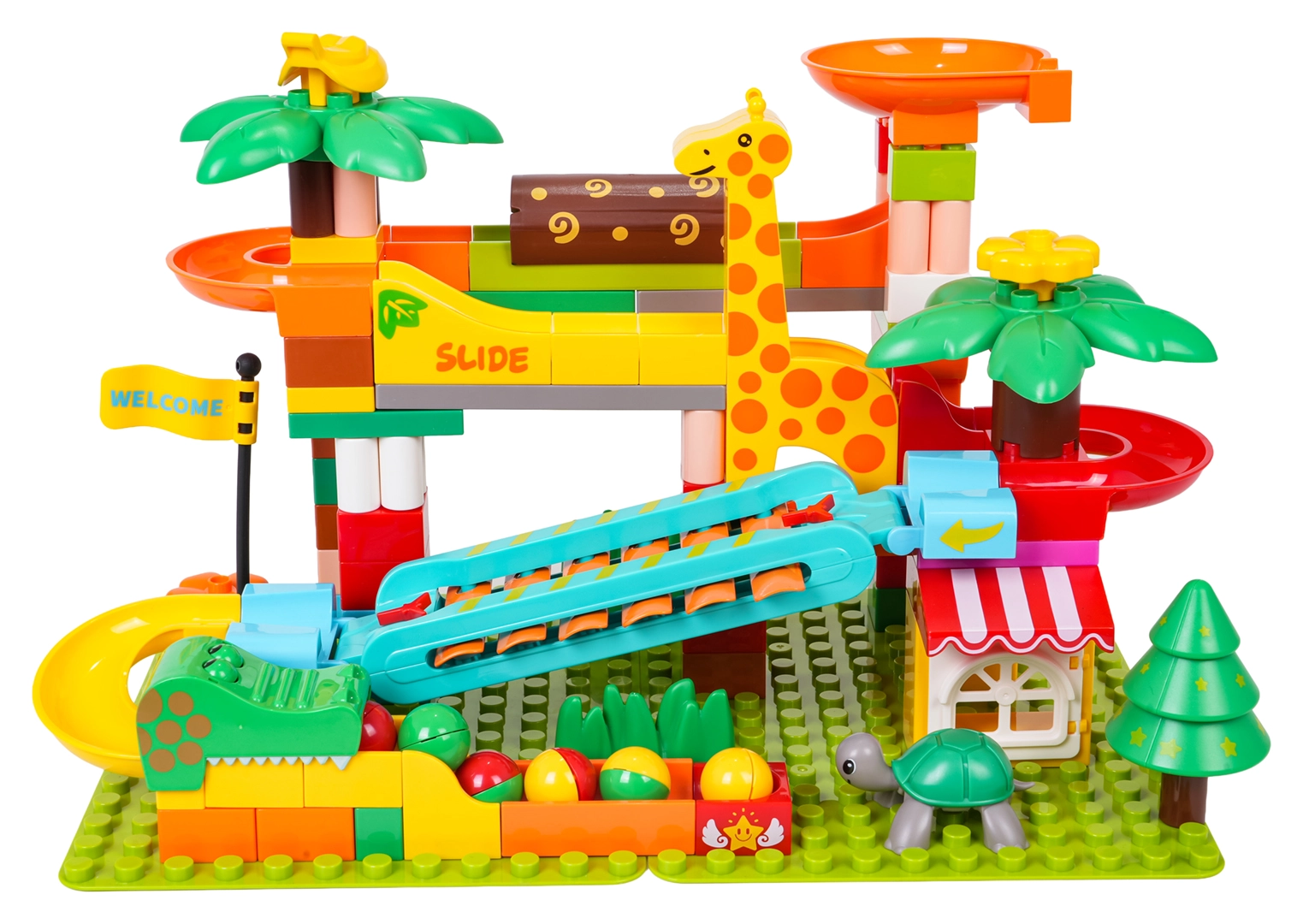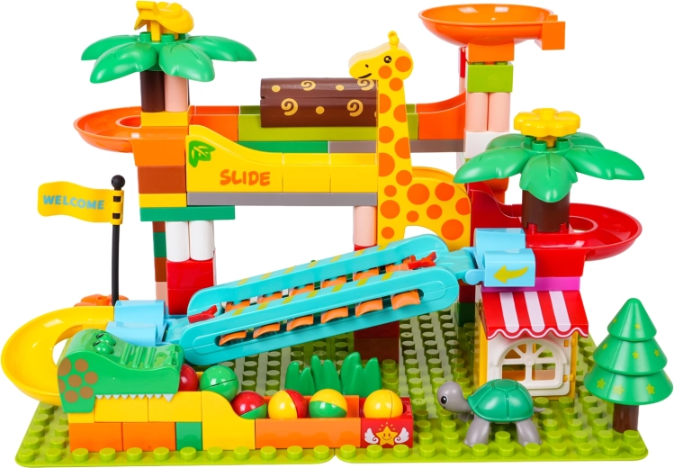 Kleurrijke hellingen, trechters en glijbanen met palmdecoraties en dieren nodigen uit om steeds nieuwe banen te bouwen.