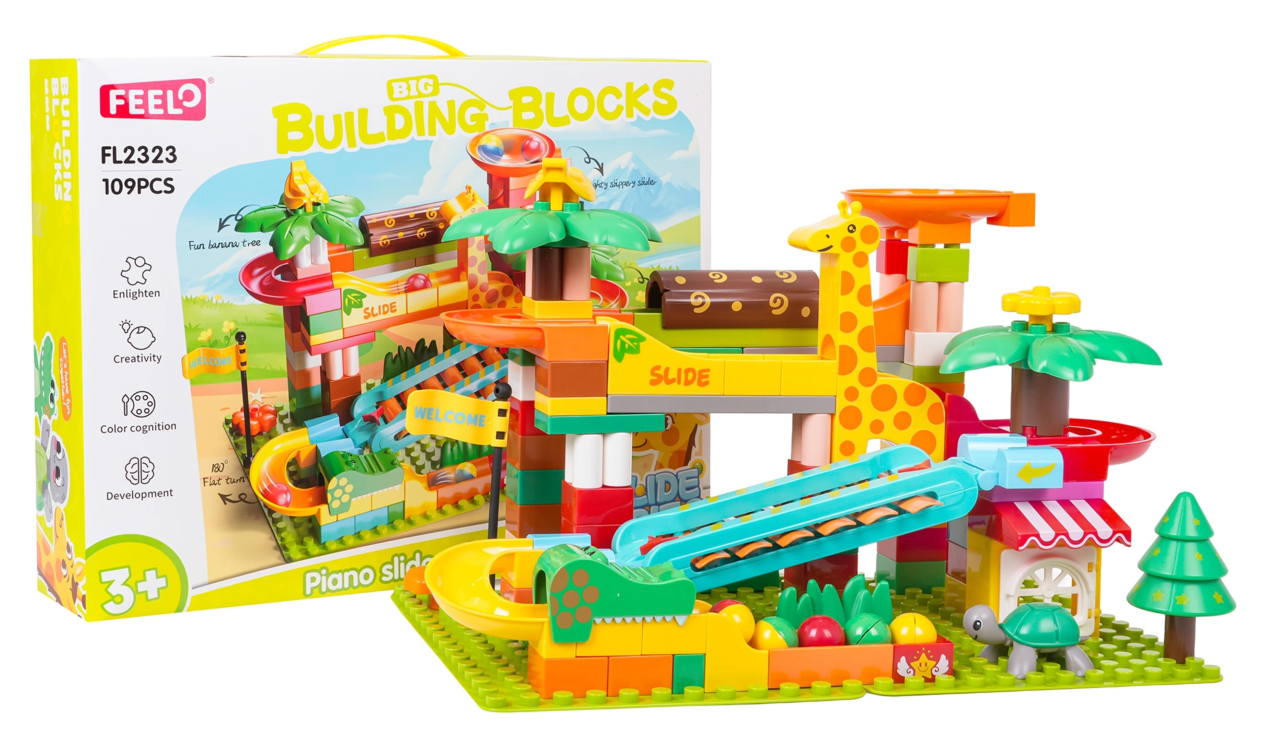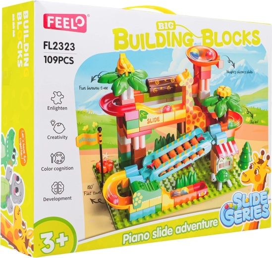 Deze creatieve bouwset brengt een safari-sfeer naar de kinderkamer: palmbomen, dieren en een huisje worden gecombineerd met een doordachte knikkerbaan met glijbanen, trechters en een pianoelement – wanneer de knikkers over de cimbaaltjes rollen, ontstaan vrolijke melodieën. Een stabiele basis en eenvoudig vastklikken van de onderdelen garanderen zorgeloos bouwen en spelen.