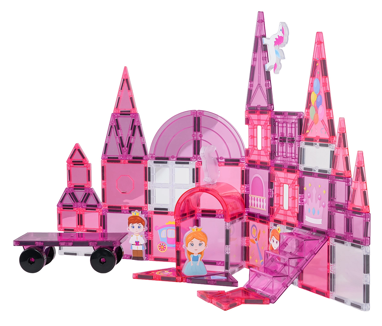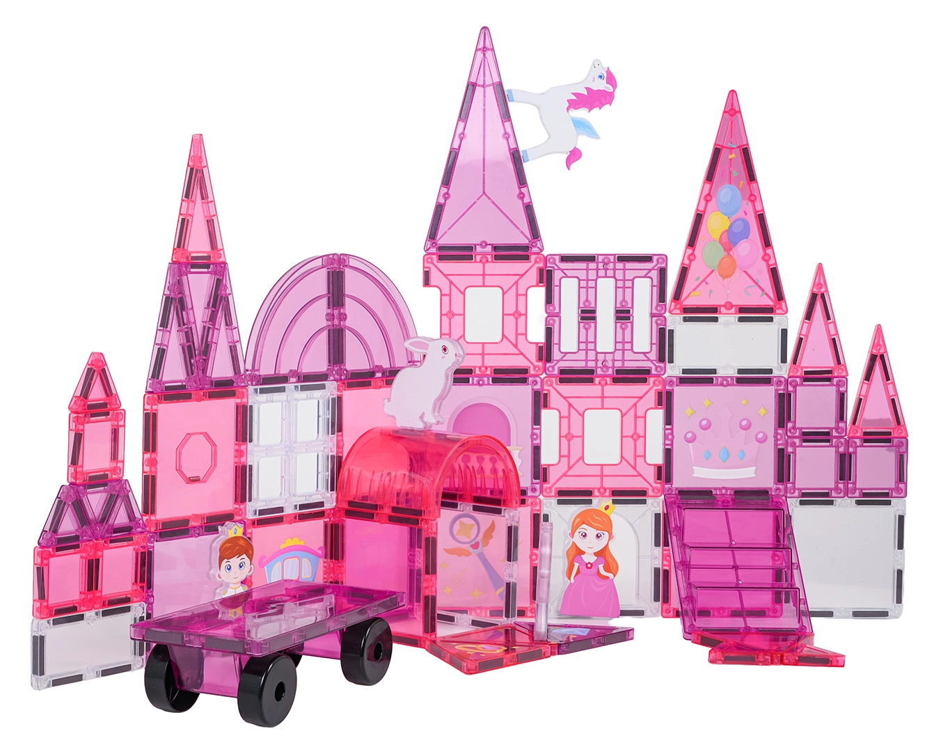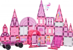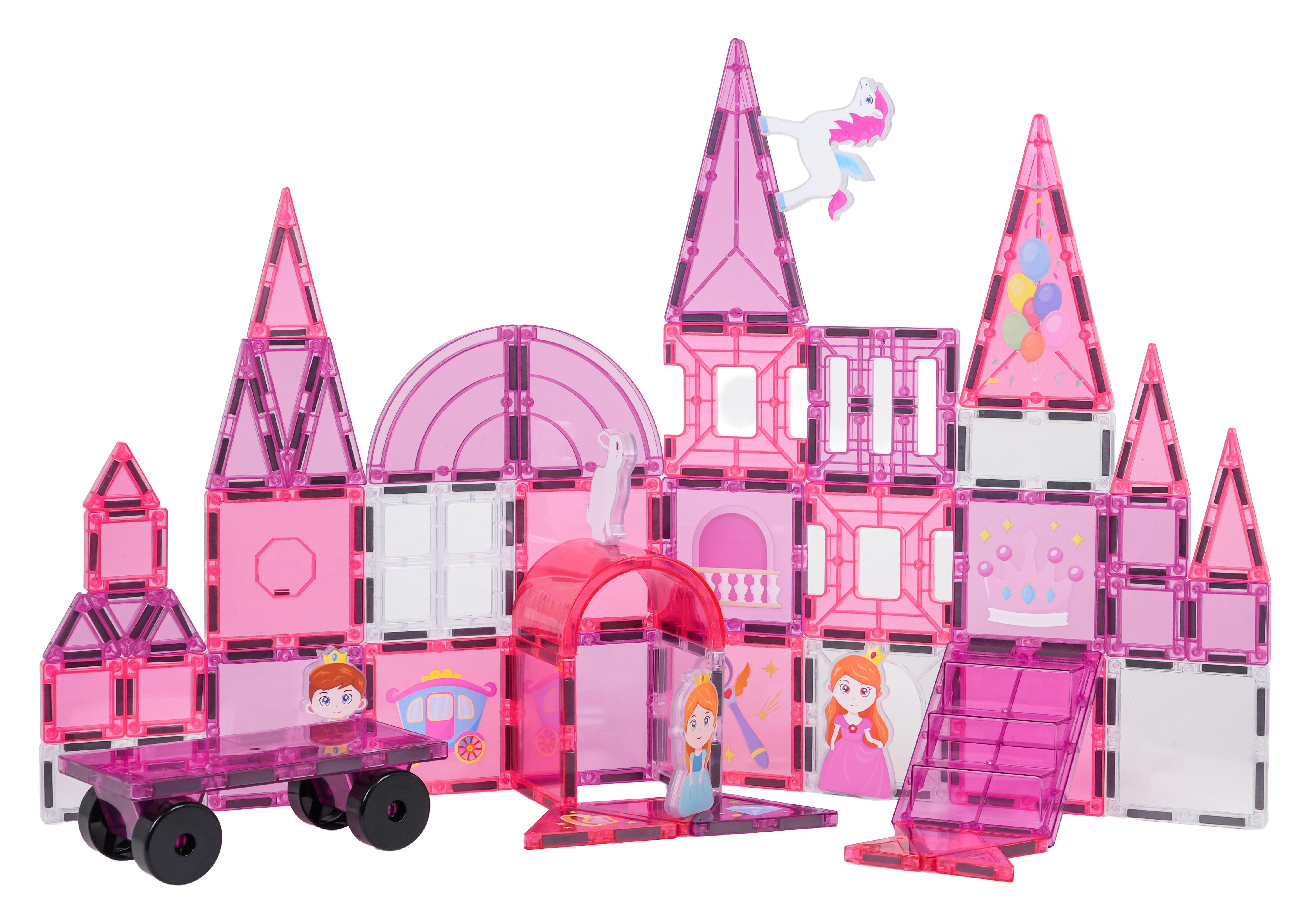 De magnetische bouwset Roze prinses brengt kinderen een wereld vol fantasie en creativiteit. Transparante, gekleurde onderdelen in diverse vormen klikken intuïtief in elkaar en maken het mogelijk torens, poorten, ramen, trappen en complete sprookjeskastelen te bouwen. Dankzij het onderstel met wielen kun je ook koetsen of karretjes maken en de meegeleverde figuurtjes in het spel betrekken.